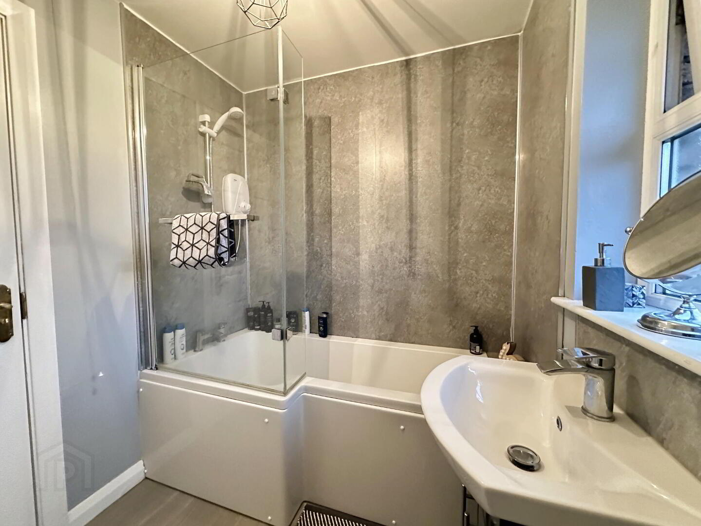 - Luxury white suite comprising close coupled WC, vanity unit with wash hand basin and mixer tap and shower bath with mixer tap, Mira thermostatic power shower over and shower screen, shower board panels, tiled floor, 1 radiator.