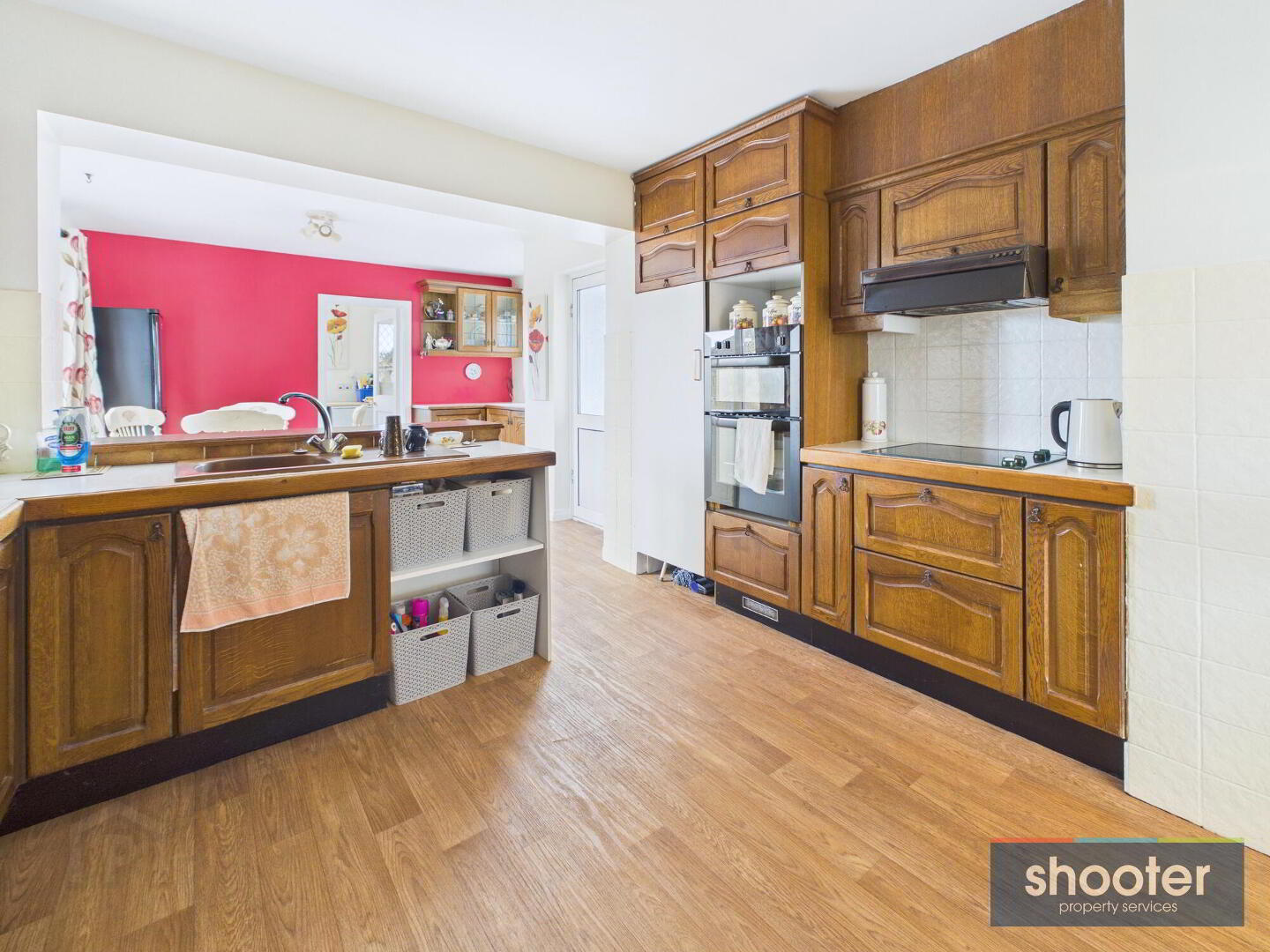 - High and low level units with sink unit, fridge-freezer, two floating ovens, hob and extractor fan. Part tiled walls and vinyl floor.