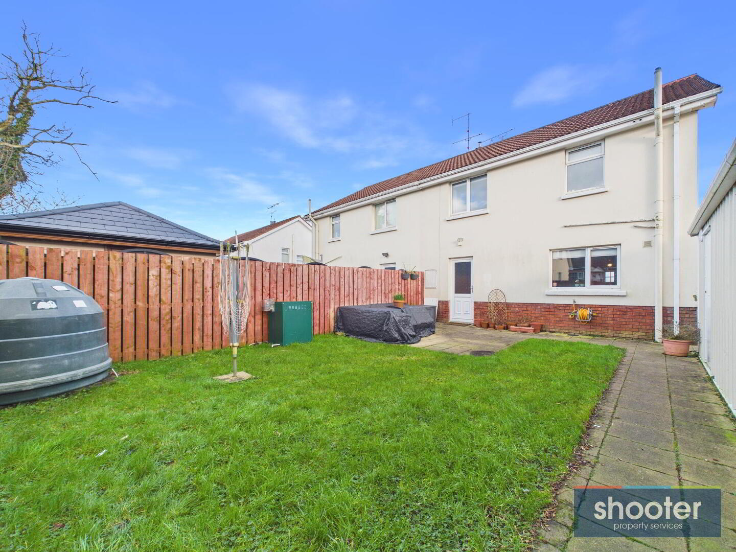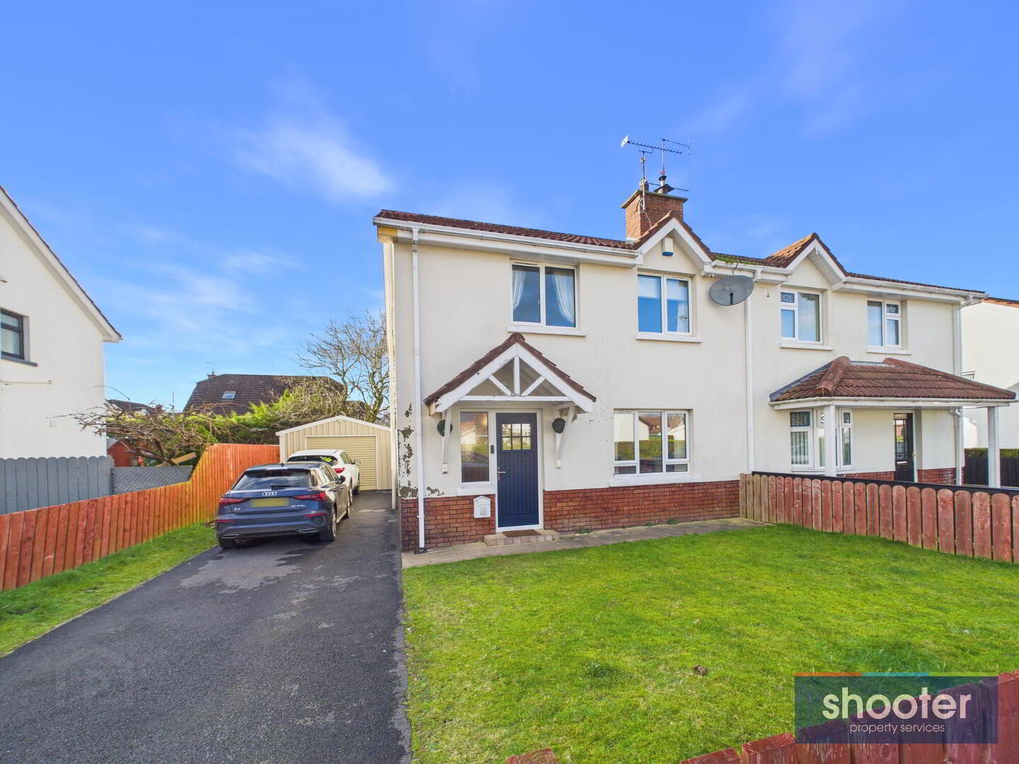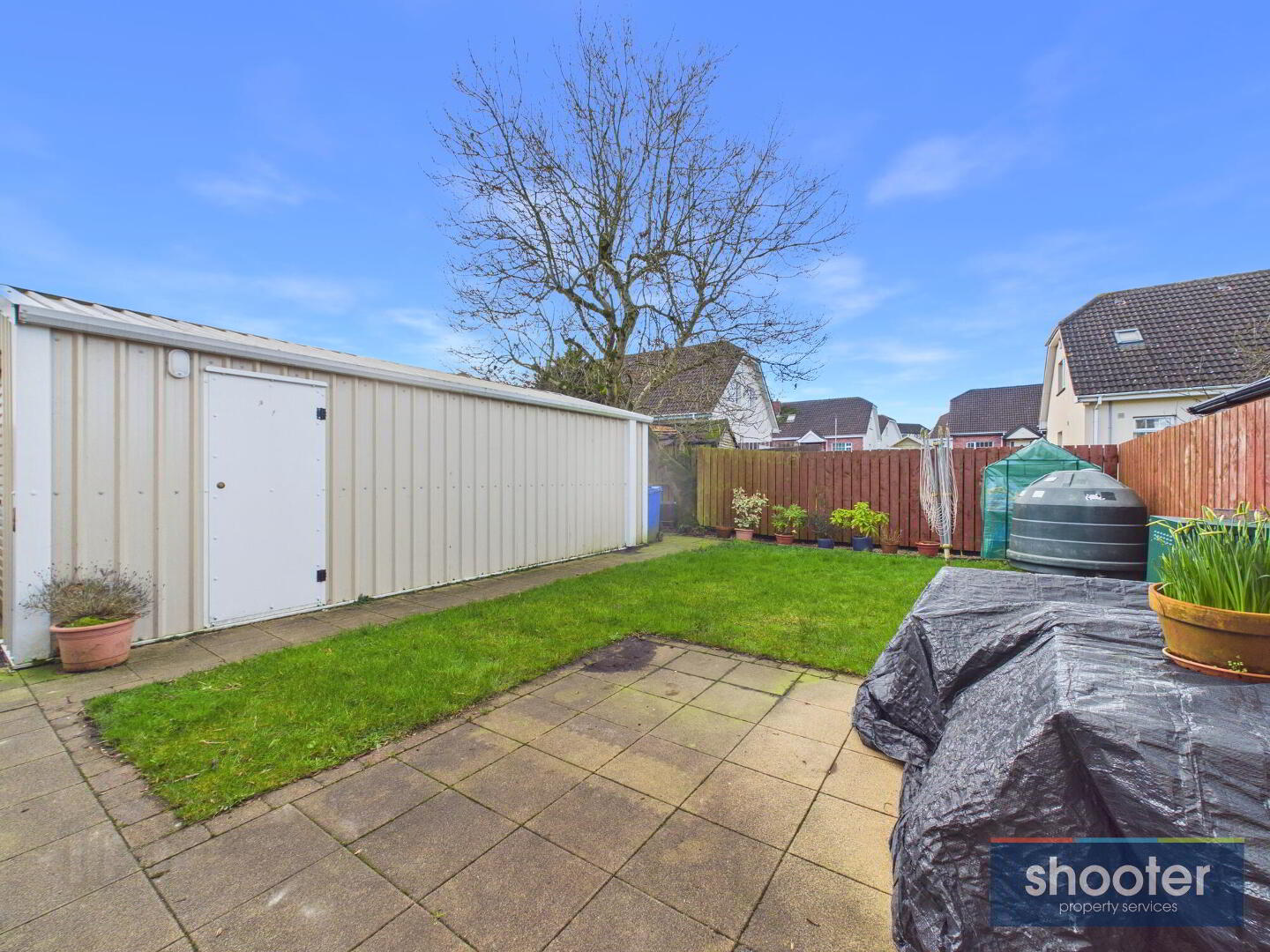 Tarmacadam driveway with parking to side. Front grass lawn. Enclosed rear garden with gated access. Grass lawn, large shed and enclosed fence area. Watertap, and outside light.