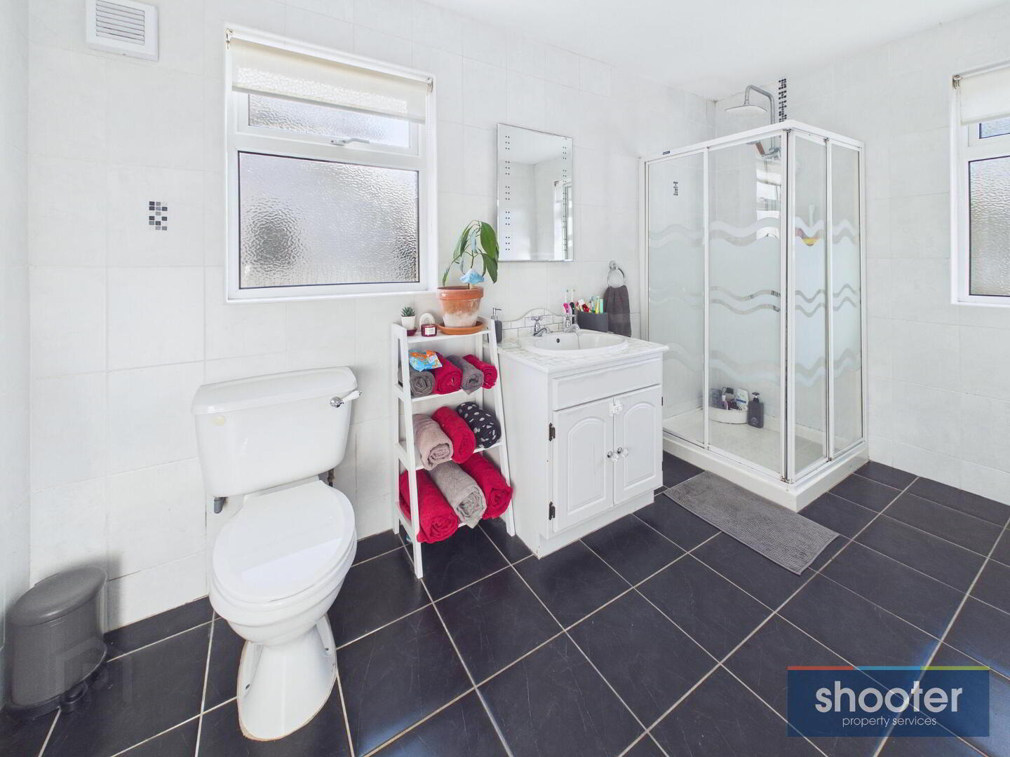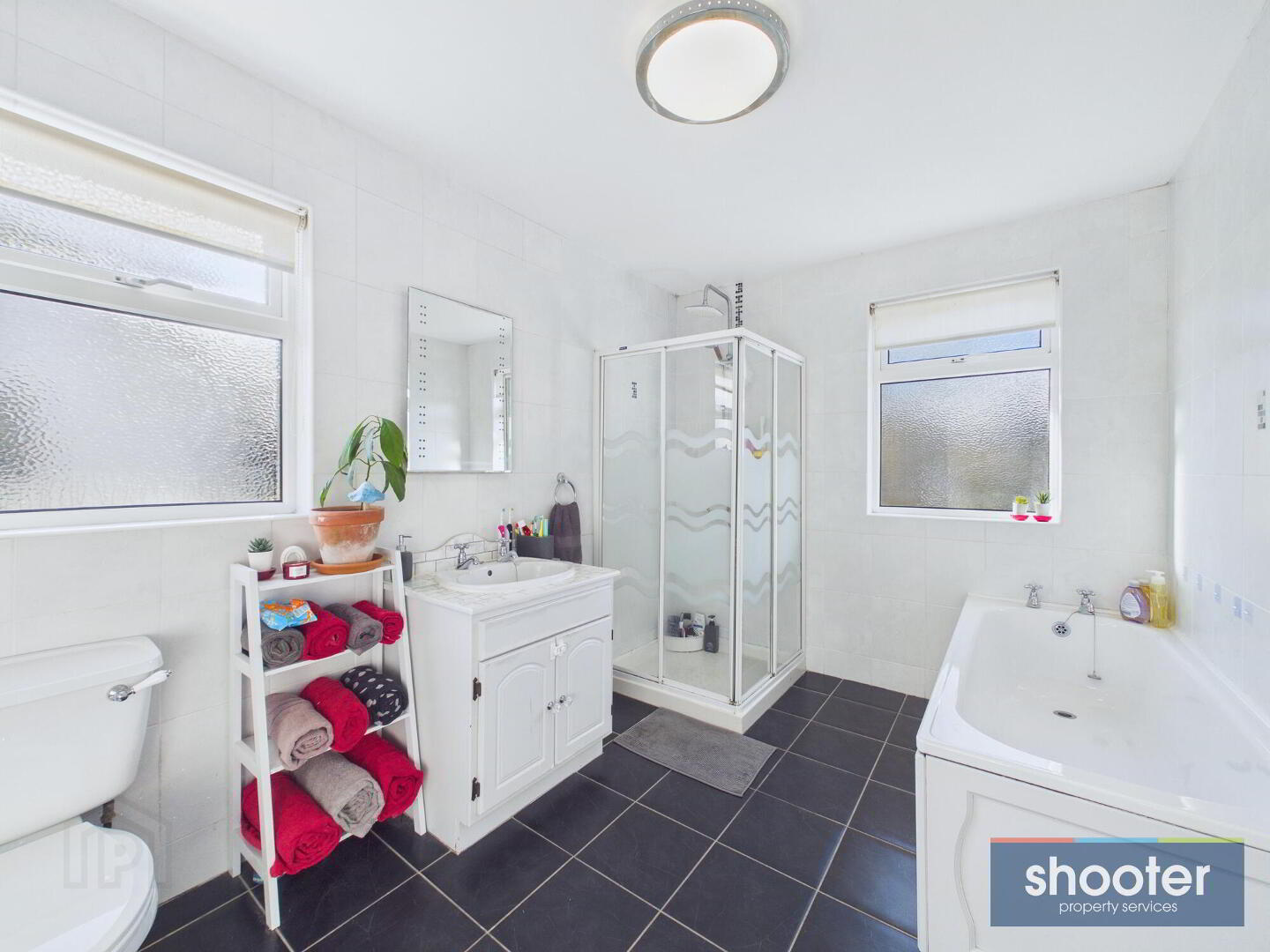 White panel bath, vanity unit with wash hand basin, toilet and enclosed shower cubicle with mains shower. Fully tiled walls and floor.
