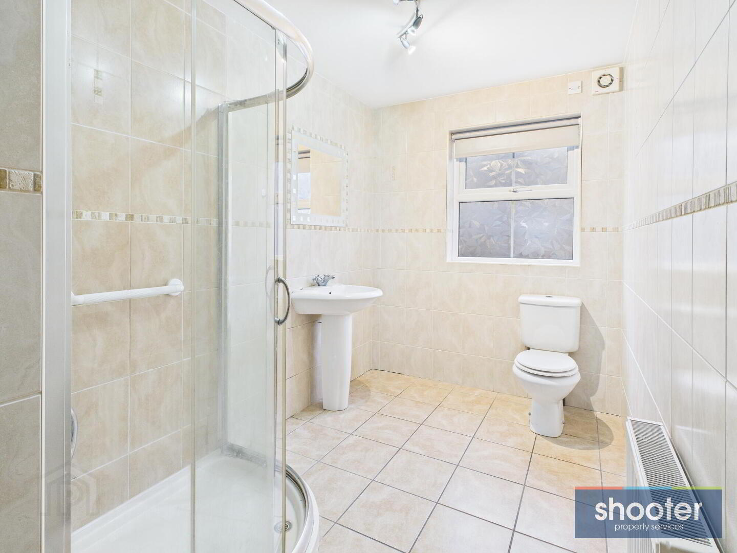 - Low flush toilet, pedestal wash hand basin and quad shower unit. Mirror and extractor fan. Fully tiled walls and floor. Hotpress off.