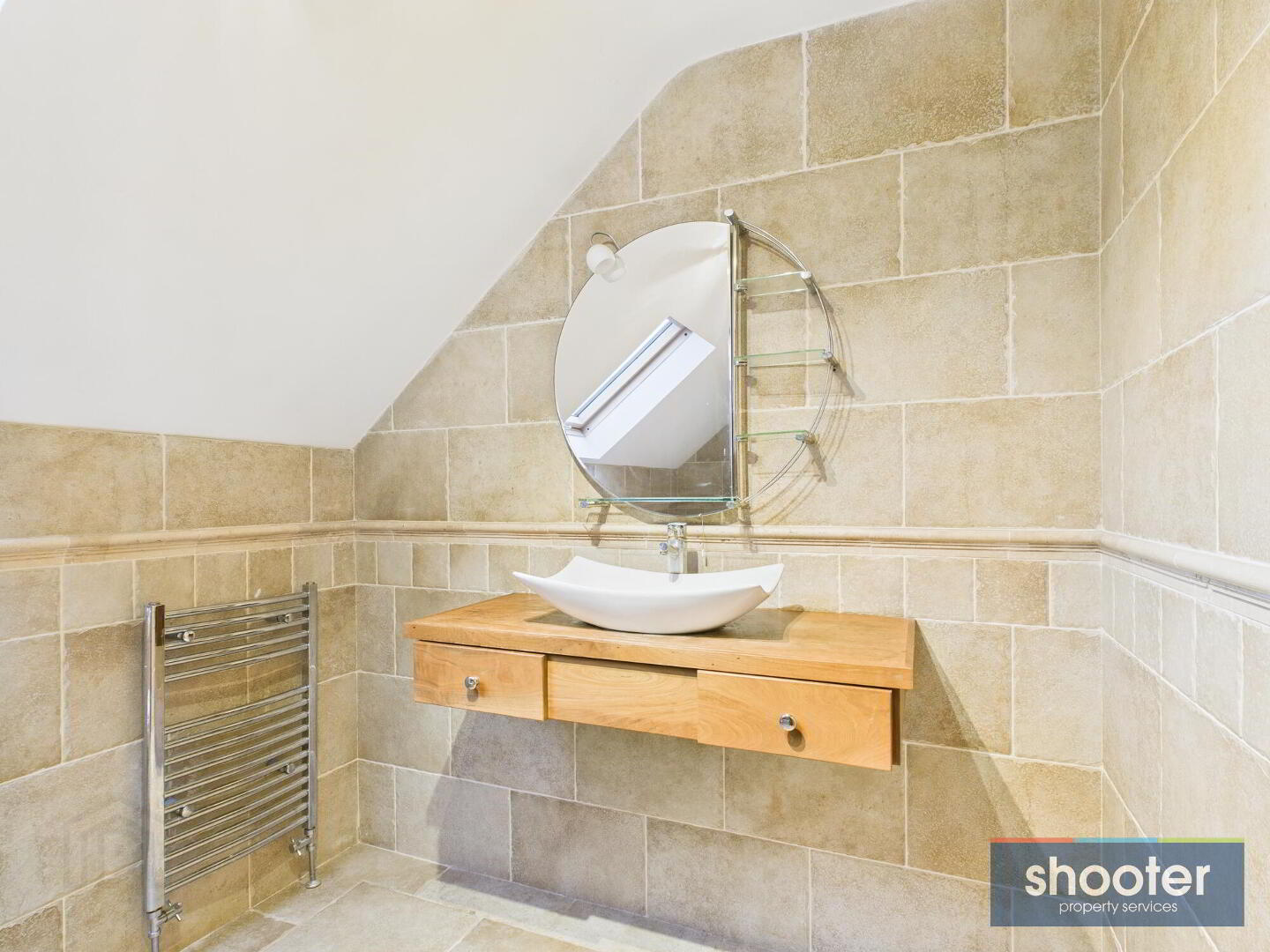 - Low flush toilet, tiled bath and hanging vanity unit with wash hand basin. Heated towel rail. Velux window and extractor fan. Fully tiled walls and floor.