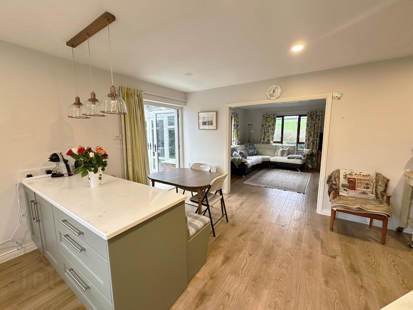 Full range of high and low level fitted modern units with quartz worktops and upstands incorporating 1 1/2 bowl composite sink unit and Quooker hot water tap, window pelmet with low voltage downlighting, worktop lighting and bench seating. Stanley oil fired range with high output back boiler linked to central heating system, built-in fridge/freezer and fully integrated dishwasher, fully tiled floor, double radiator. Open plan to…