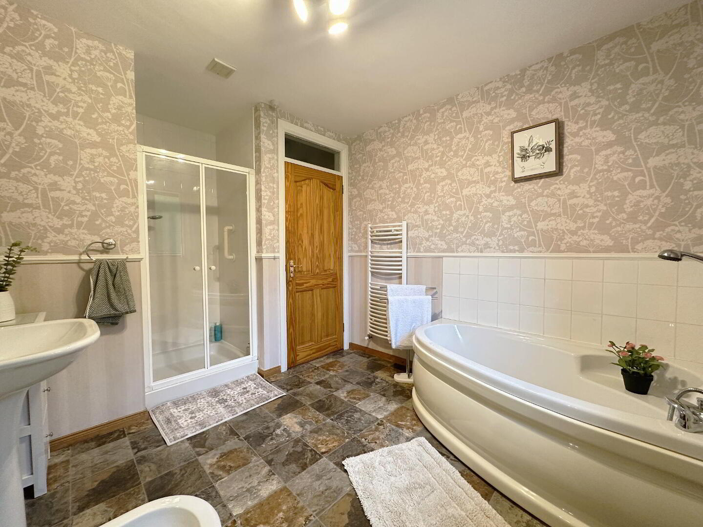 White suite comprising low flush WC, pedestal wash hand basin with mixer tap, bidet, offset bath with mixer tap shower attachment and fully tiled shower enclosure with thermostatic mixer shower, heated towel rail.