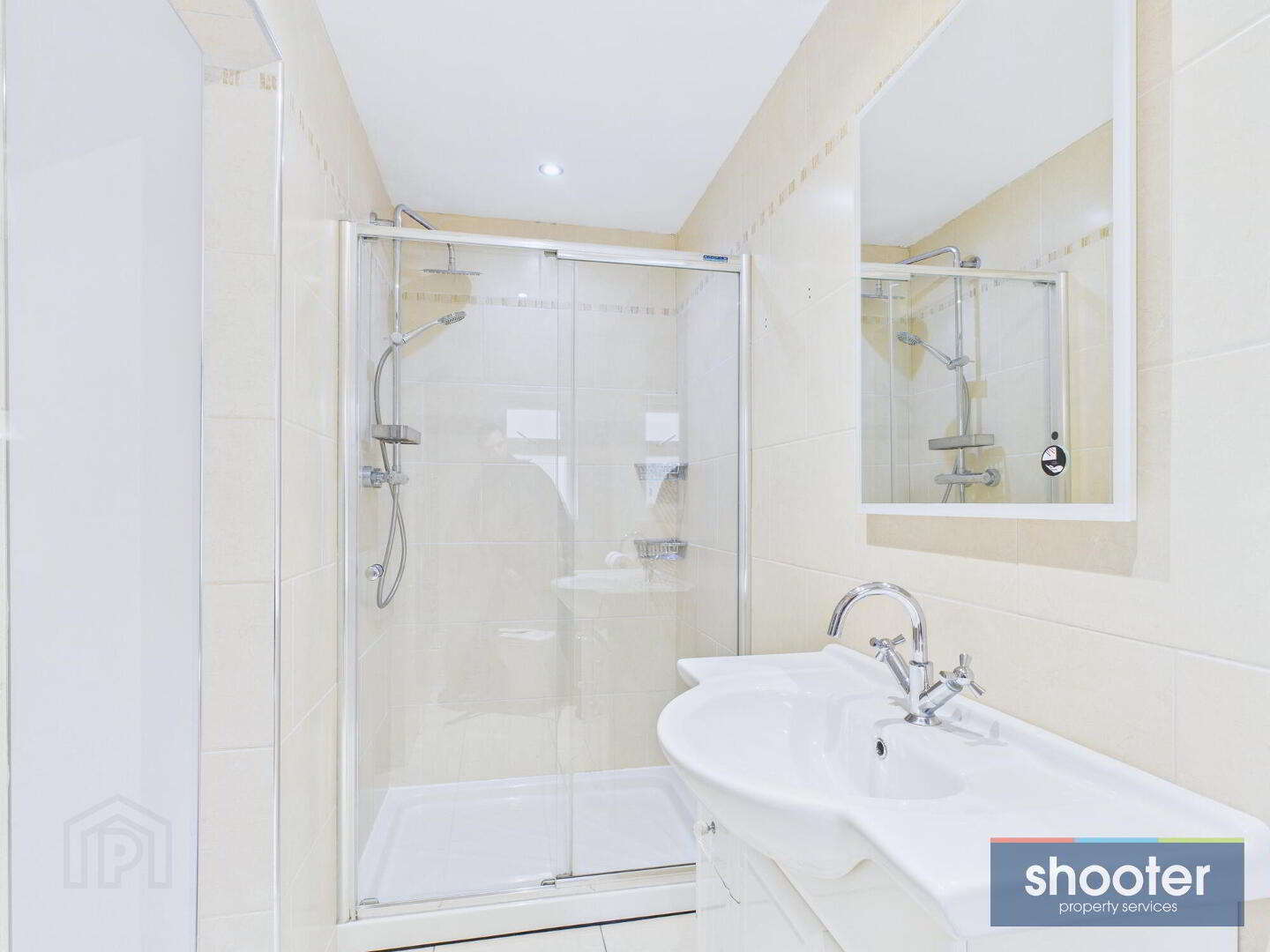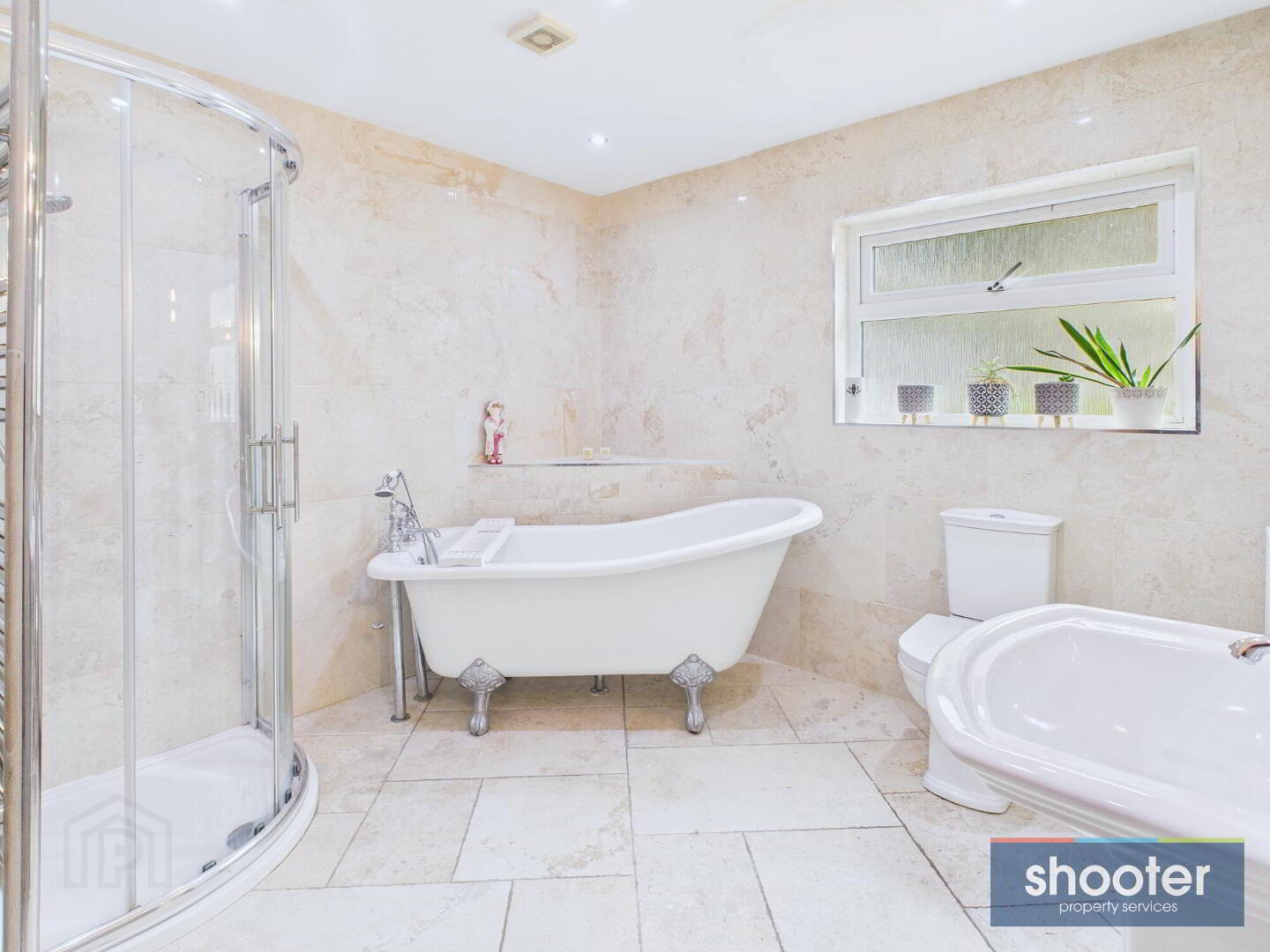 Free standing bath, toilet, pedestal wash hand basin and shower. Heated towel rail. Extractor fan and recessed ceiling lights. Ceramic tiled floor and walls.