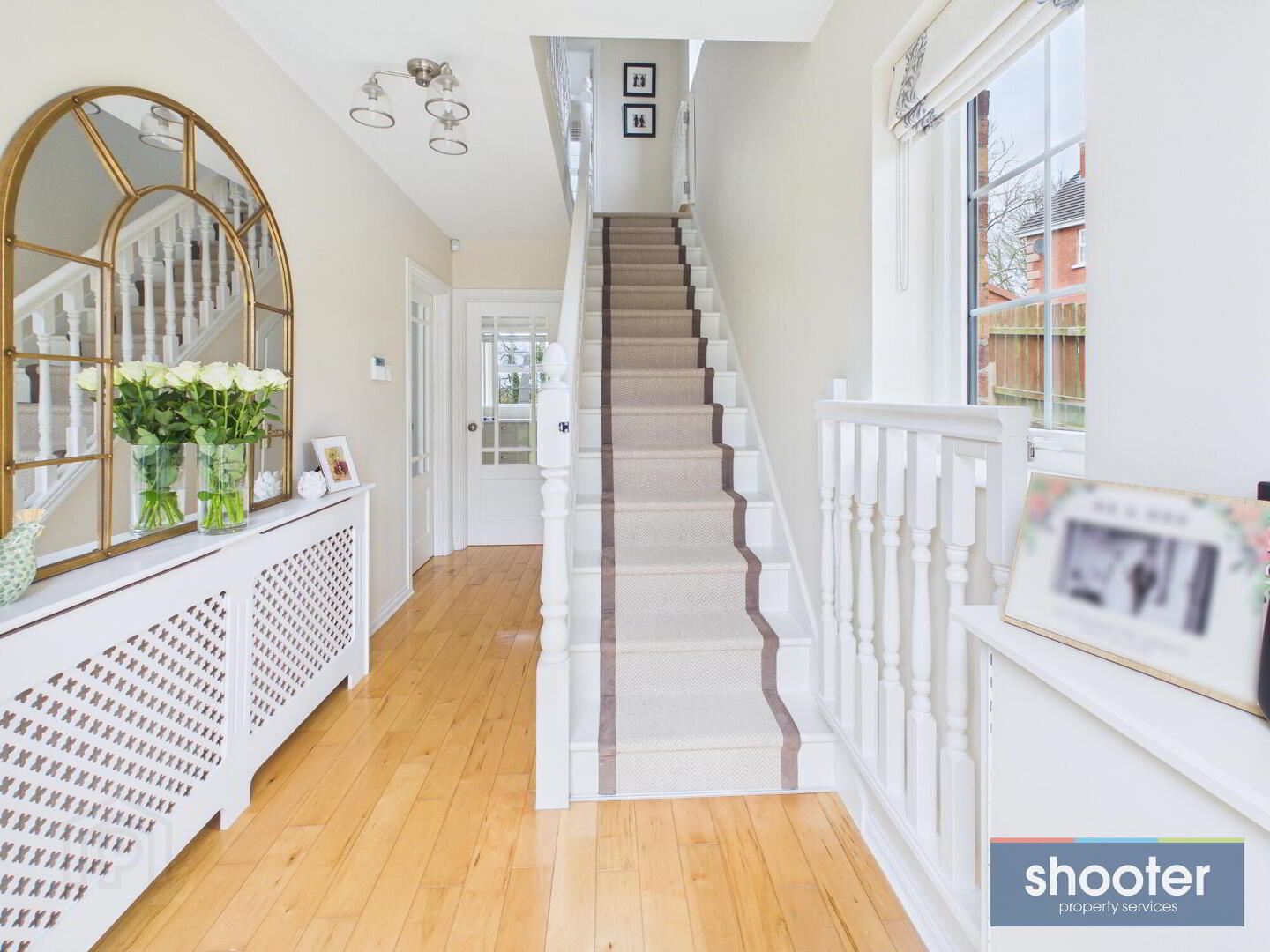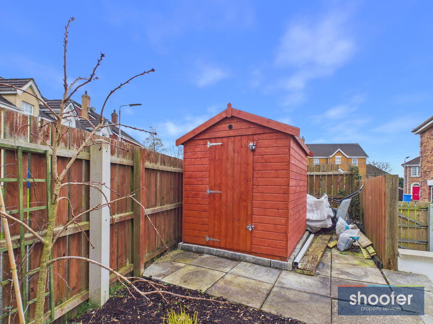 Tarmacadam driveway with parking to side. Neat grass lawn to front. Stepped up entrance with cast iron railings and wall lights. Fully enclosed rear garden with gated entrance. Paved patio area with large flat grass lawn. Paved path and decorative stone beds. Stepped up patio area with garden shed. Large decorative flower bed with an array of plants and shrubs.