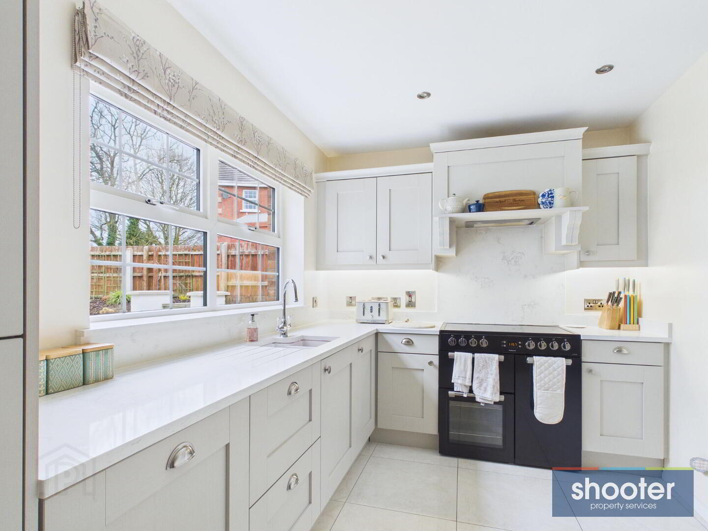 Modern range of high and low level units with quartz worktops incorporating ceramic sink unit, integrated dishwasher, fridge-freezer and Cookmaster electric range cooker. Recessed ceiling lights and ceramic tiled floor.