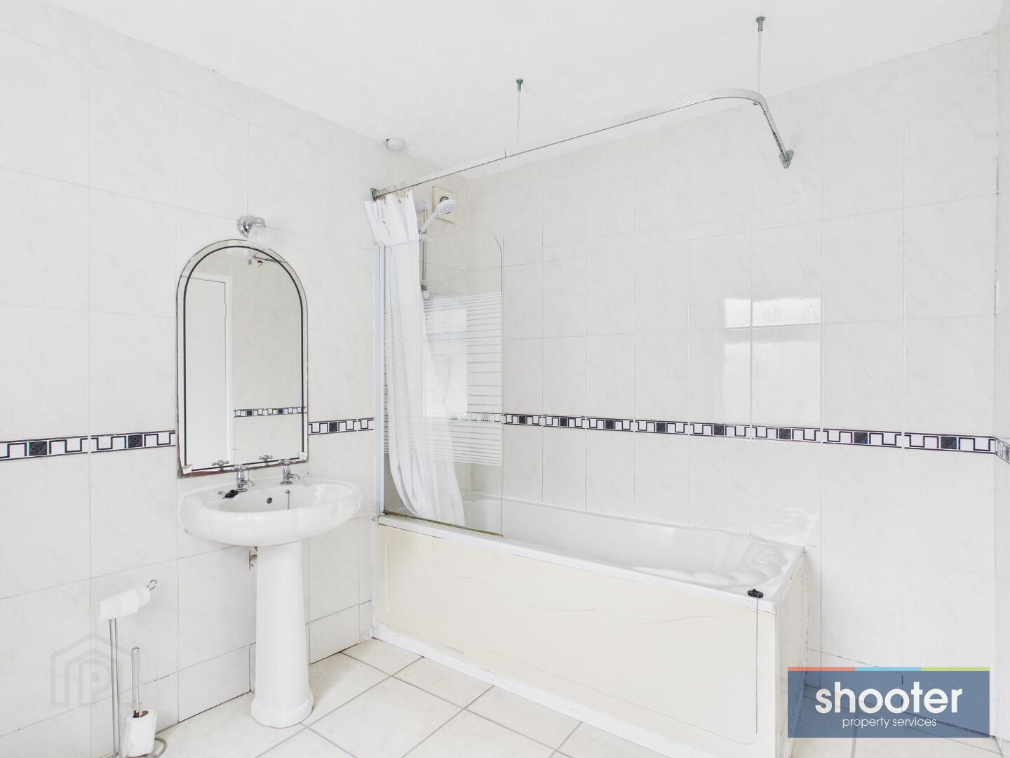- Pedestal wash hand basin, toilet, bath with shower screen and tritan electric shower, tiled walls and floor