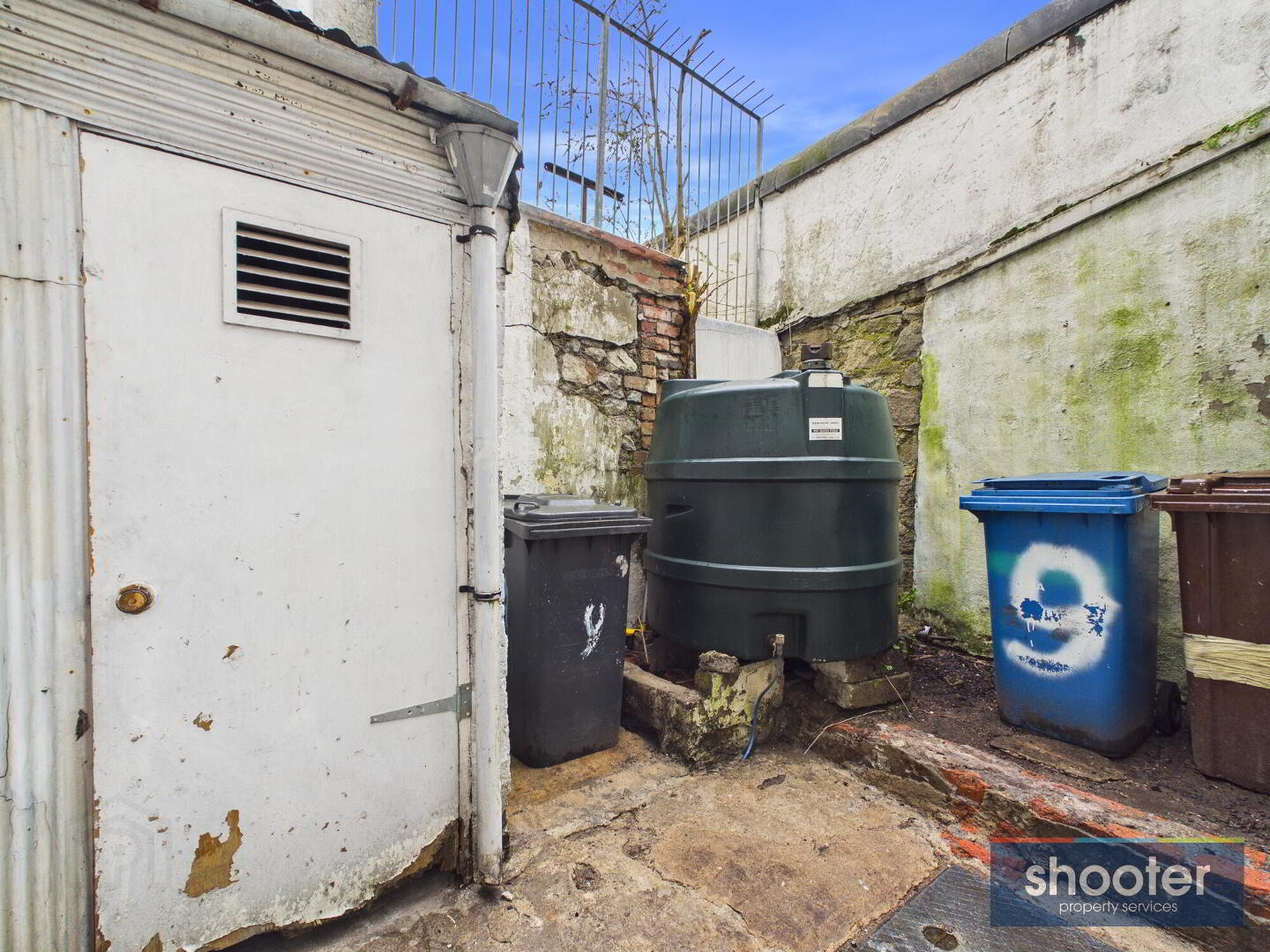 - High and low level units, 1 1/2 stainless steel sink unit, cooker, washing machine, electric fan, space for fridge freezer, part tiled walls, vinyl flooring, PVC door leading to rear yard.