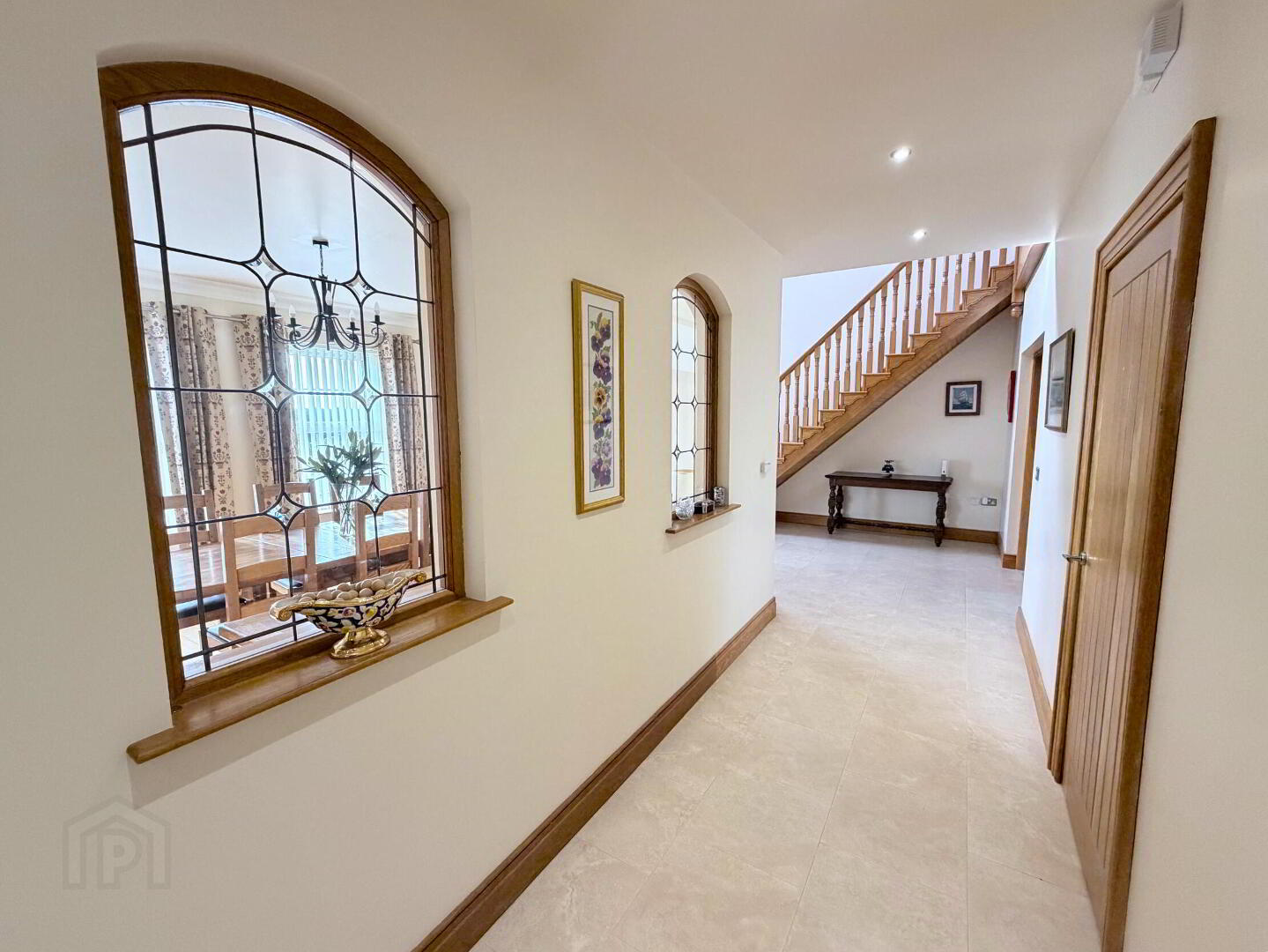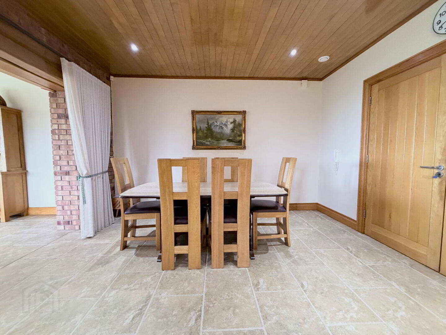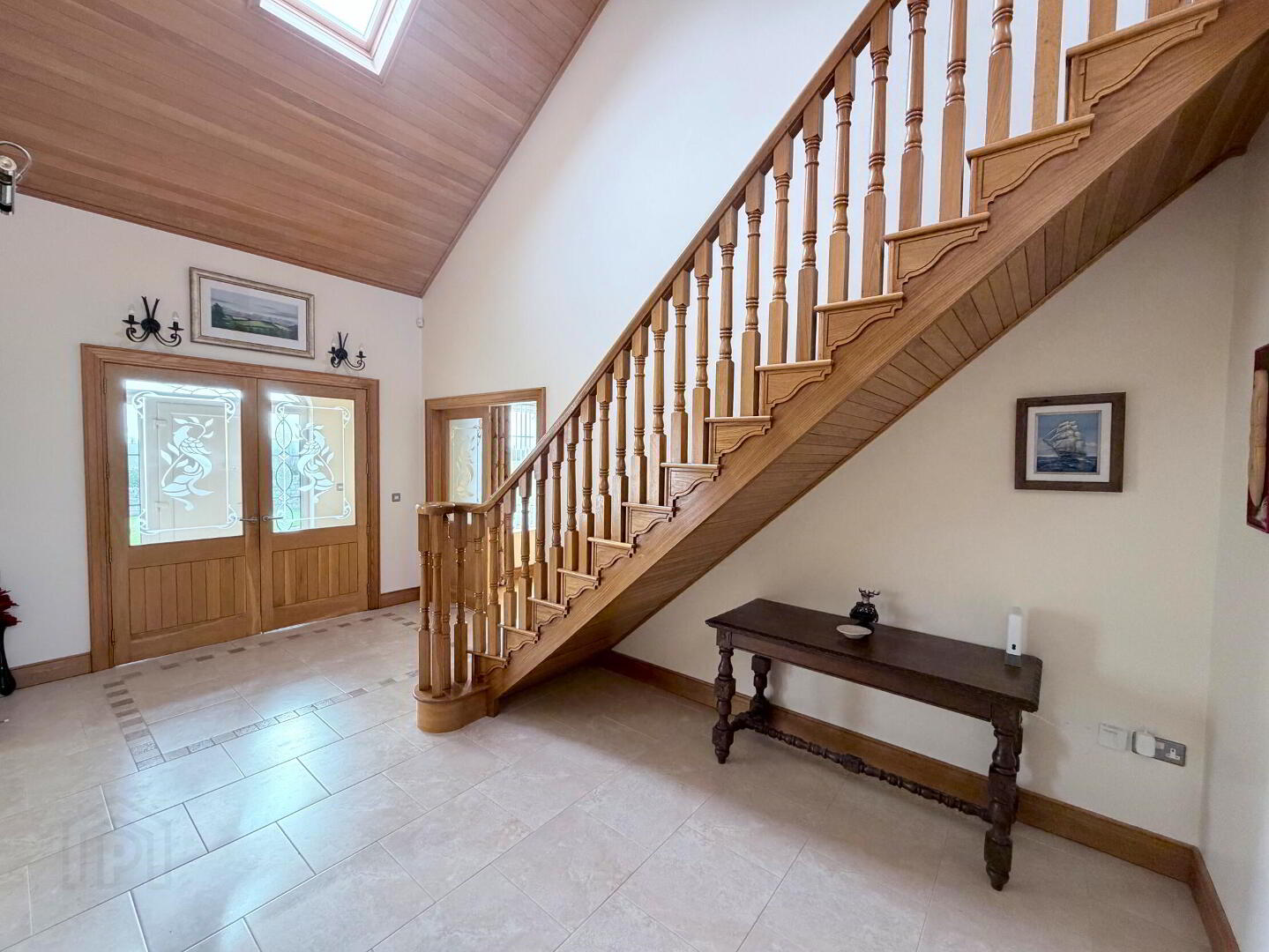 - PVC front door with double glazed side panels and fan light, tiled floor, tongue and groove oak panelled ceiling.