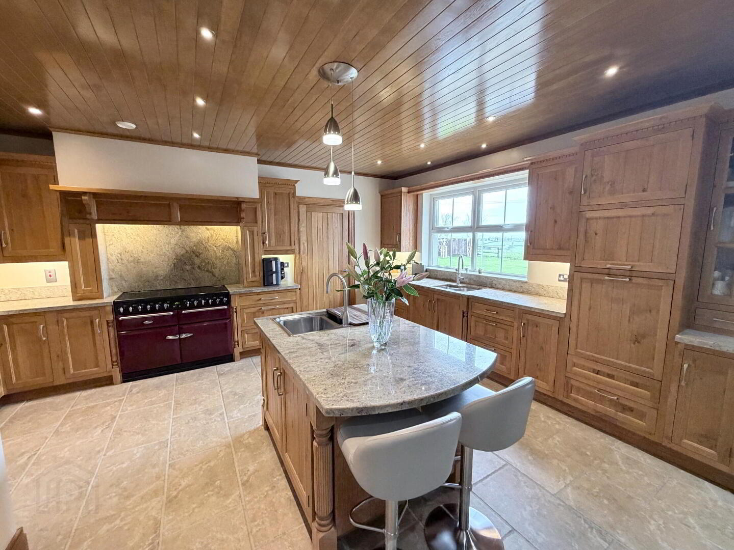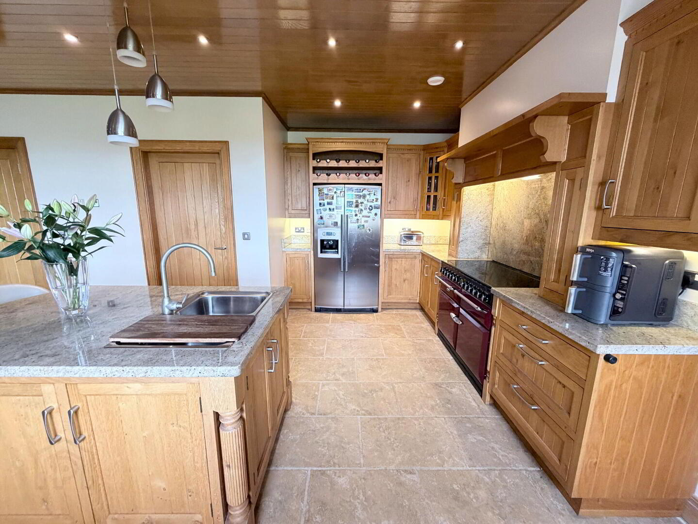 - Full range of high and low level fitted inset oak units with granite worktops and upstands incorporating 1 1/2 bowl stainless steel sink unit and Quooker hot water tap, Window pelmet and glazed display unit, matching island unit with 1 3/4 bowl stainless steel sink unit and mixer tap. Stanley electric range with induction hob, surround, extractor hood and downlighting, housing for American style fridge/freezer with wine rack, fully integrated dishwasher and concealed microwave space. Worktop lighting, fully tiled floor, oak panelled ceiling with recessed ceiling spots, walk-in shelved pantry with light, open plan to…