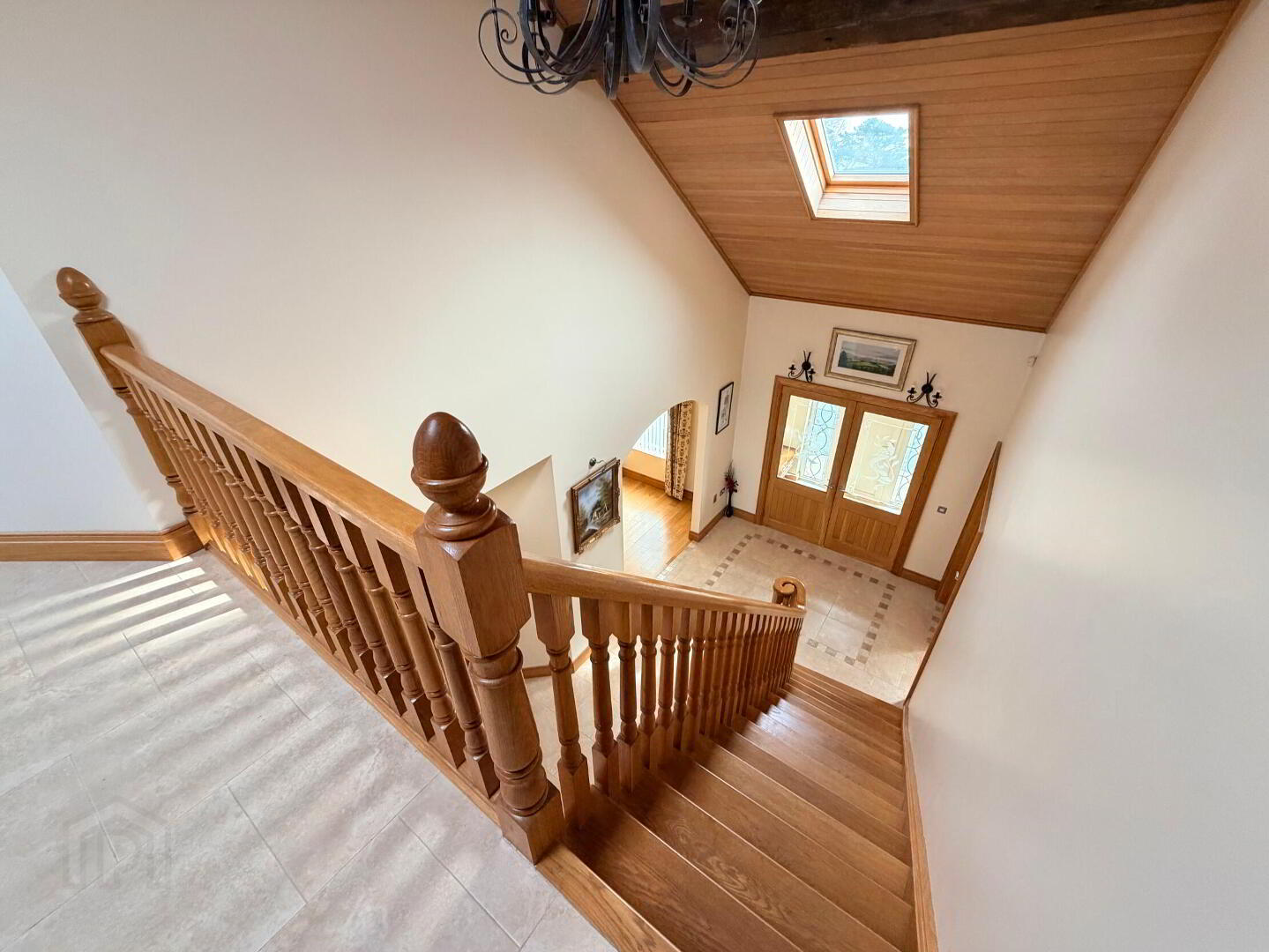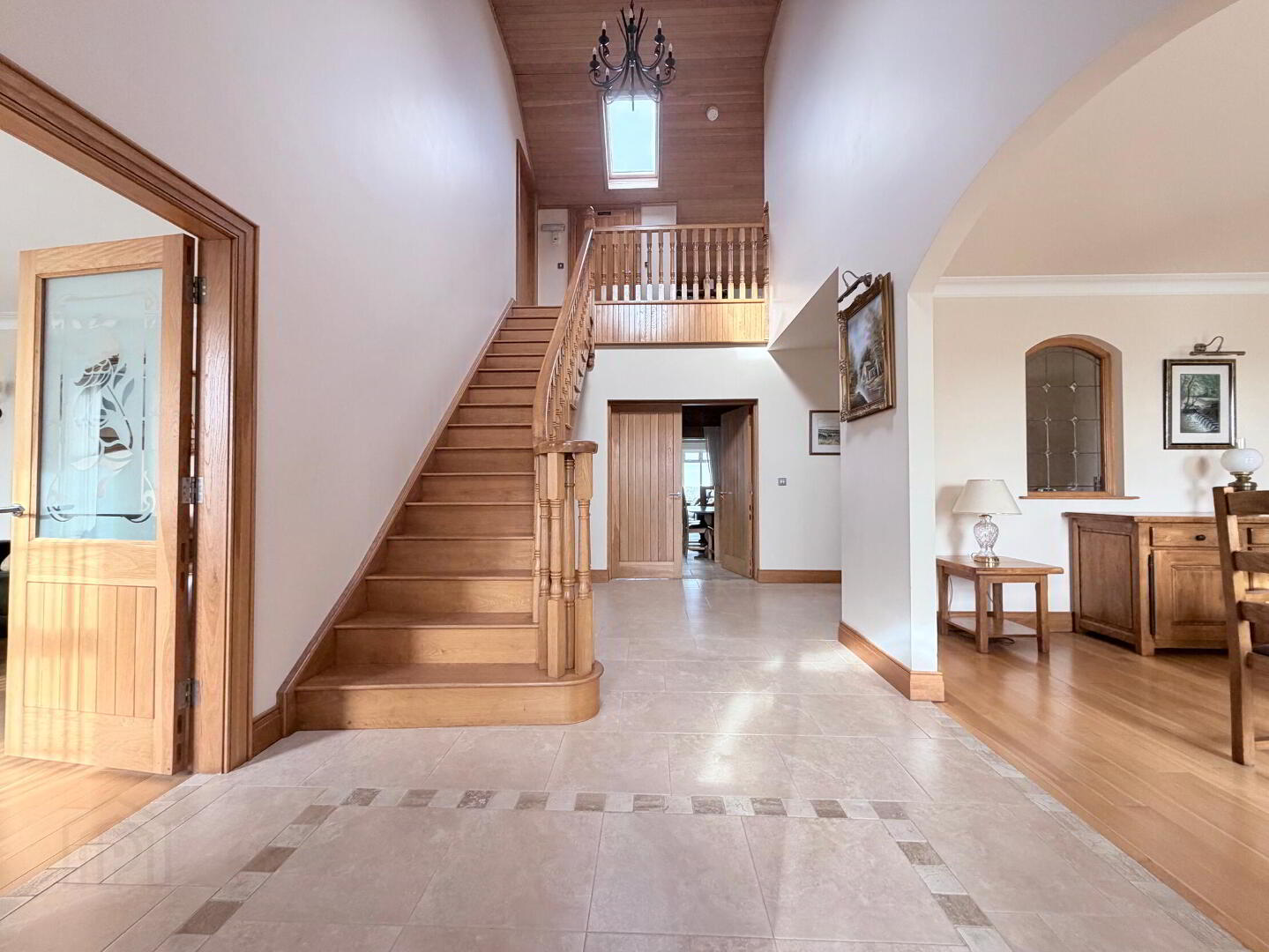 - Glazed double oak doors to spacious fully tiled reception hall, oak staircase to gallery landing, tongue and groove panelled oak ceiling, twin double glazed Velux rooflights.