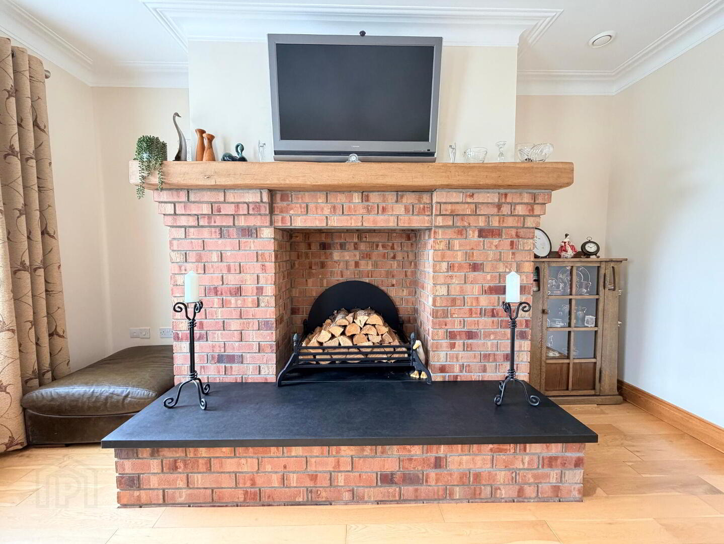 - Glazed oak double doors from hall, feature brick built ‘inglenook’ style fireplace, slate hearth and oak sleeper mantel, oak wooden floor, coved ceiling and 3 wall light points.