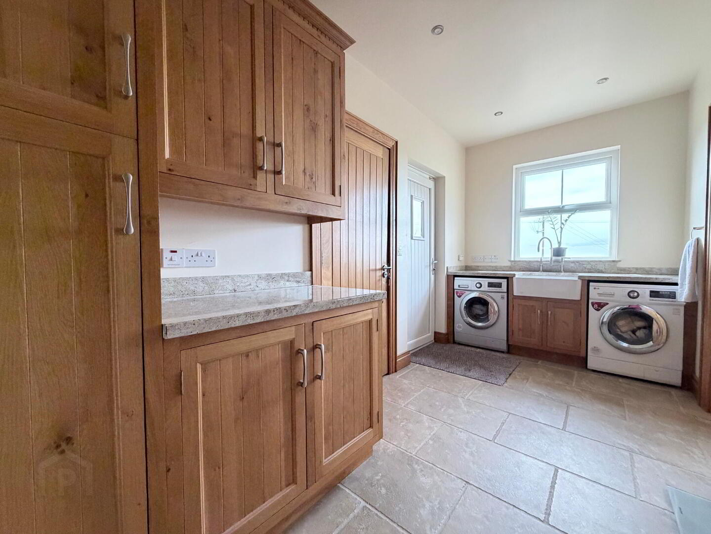 - Matching fitted high and low level units with granite worktop incorporating Belfast style sink and mixer tap, plumbed for automatic washing machine, space for tumble dryer, tiled floor, recessed ceiling spots, PVC door to rear.