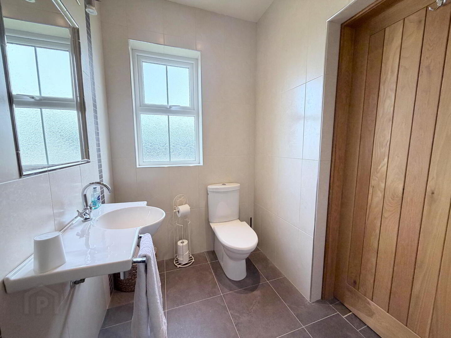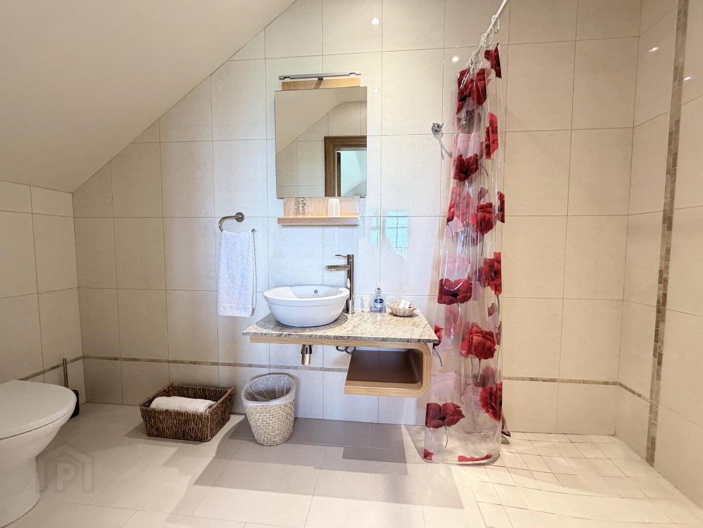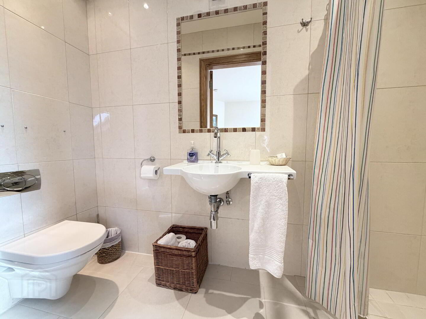 - With close coupled WC, wall mounted wash hand basin and thermostatic mixer shower, fully tiled walls and floor, fully tiled walls and floor, recessed ceiling spots.