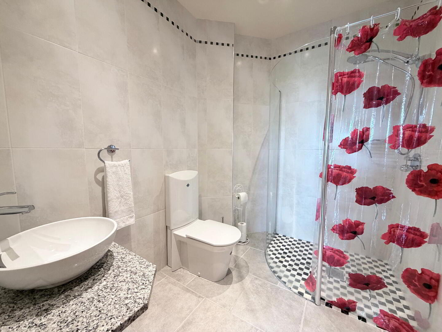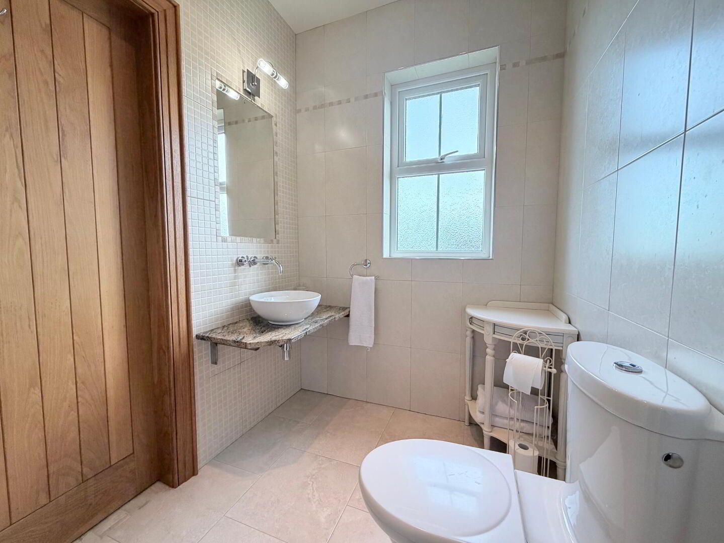 - With close coupled WC, floating sink and mixer tap on granite plinth and Axor Hansgrohe mixer shower, fully tiled walls and floor, recessed ceiling spots.