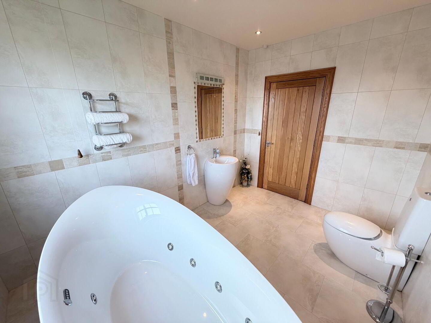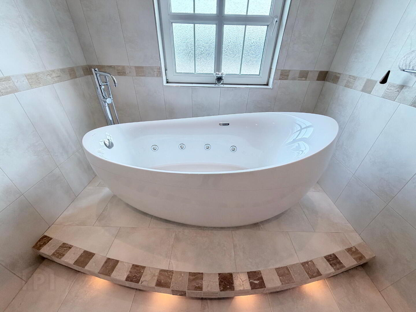 - Luxury white suite with close coupled WC, feature floor up ceramic sink unit with mixer tap and freestanding jacuzzi style bath bath and floor mounted mixer tap with shower head attachment on raised plinth floor with feature lighting, fully tiled walls and floor, recessed ceiling spots.