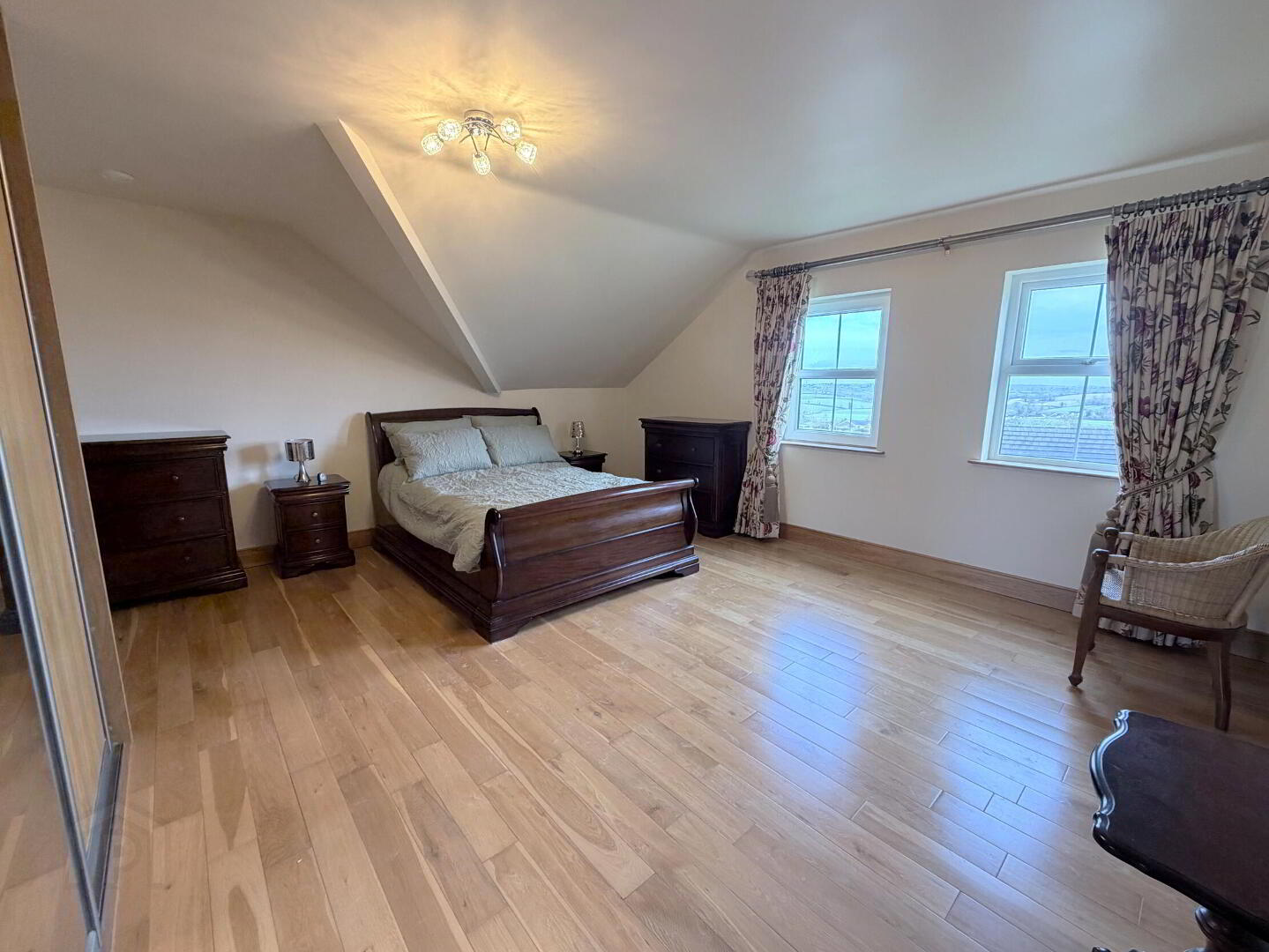 - Oak wooden floor, built-in sliderobes units with shelving and hanging spaces, walk-in storage with eaves access.