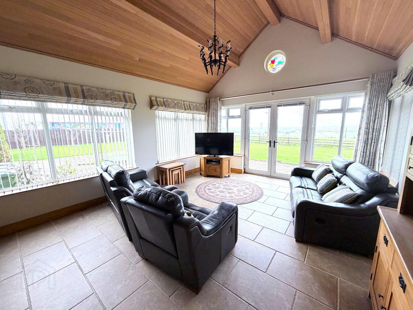 - Vaulted oak panelled ceiling, fully tiled floor, glazed double doors to patio.
