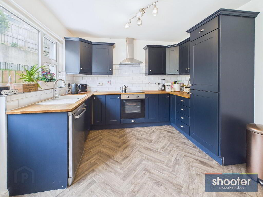 - Modern range of high and low level units and shelves with hardwood worktops, sink, Zanussi oven, touch hob, extractor fan, fridge-freezer and spaces for a dishwasher, washing machine and tumble dryer. Part tiled walls and vinyl floor. Hardwood door leading to rear patio.