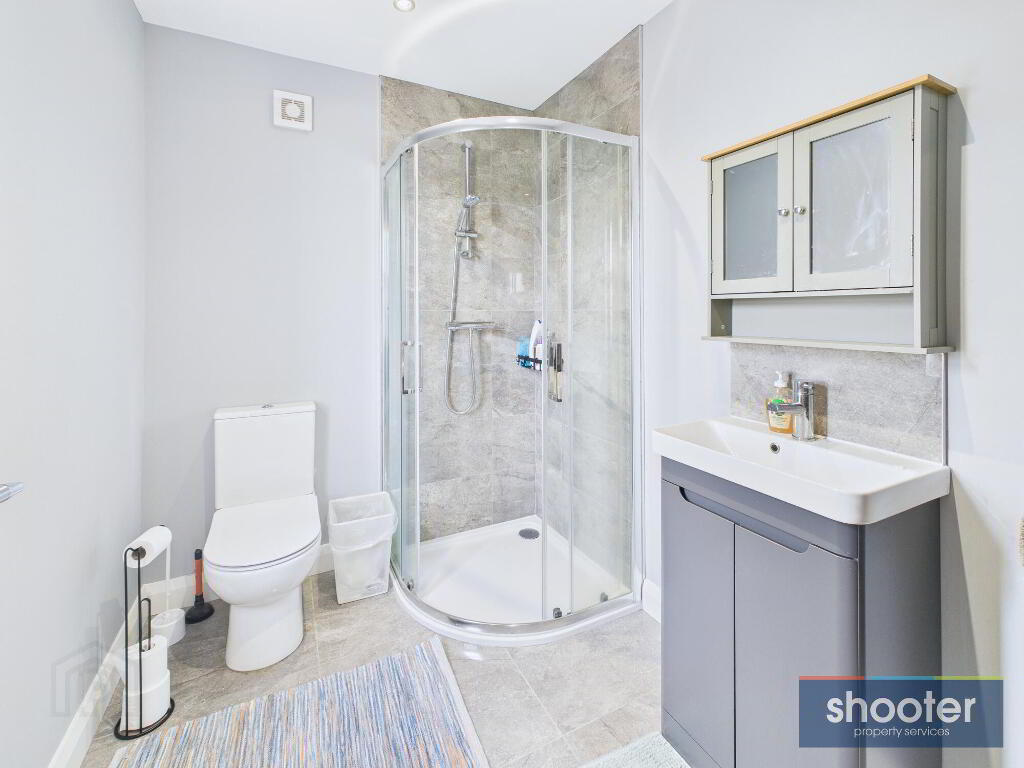 - Toilet, vanity unit with basin and corner shower cubicle with double sliding doors. Heated towel rail and extractor fan. Recessed ceiling lights. Ceramic tile floor and part tiled walls.