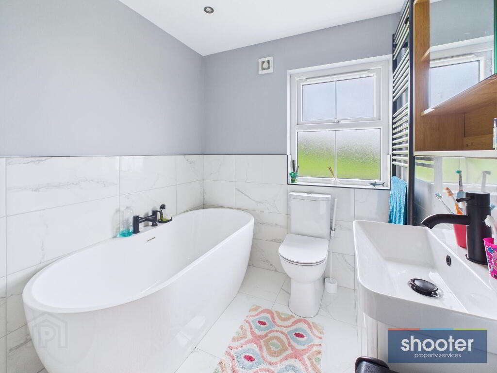 - Toilet, floating vanity unit with basin, double ended bath and shower cubicle with single sliding door. Heated towel rail and extractor fan. Recessed ceiling lights. Ceramic tile floor and part tiled walls.