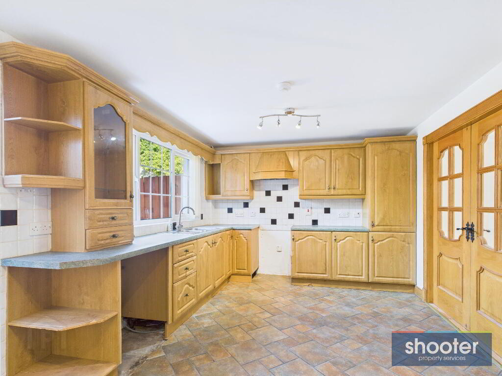 - High and low level units incorporating 1 1/2 stainless stink unit with extractor fan and integrated fridge-freezer. Space for cooker and washing machine. Ceramic tile floor and part tiled walls. Light fittings x2. PVC door to rear.