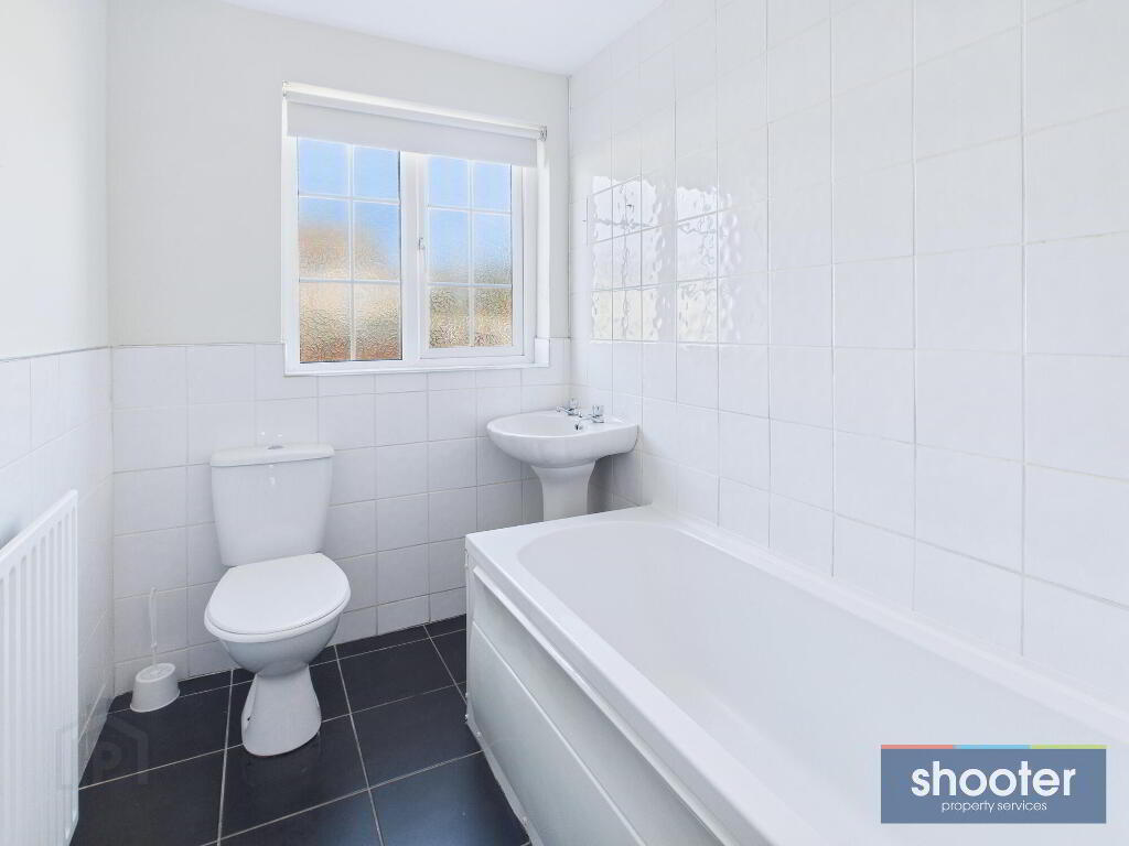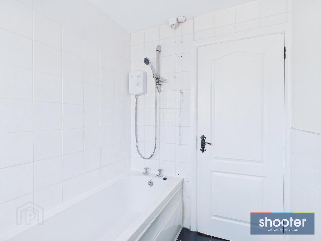 - Low flush toilet, pedestal wash hand basin, white panel bath with Triton Enrich electric shower unit overhead. Ceramic tile floor and walls.