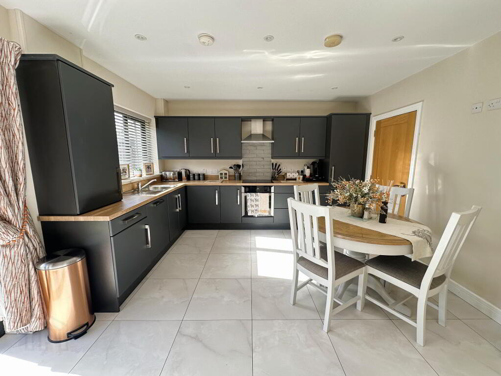 Full range of high and low level modern fitted units with single drainer stainless steel sink unit and mixer tap. Built-in oven and ceramic hob with tiled splashback and stainless steel extractor hood, built-in fridge/freezer, fully integrated dishwasher and built-in washer/dryer. Fully tiled floor, recessed ceiling spots to kitchen area, TV point, PVC double glazed French doors to garden, double radiator.