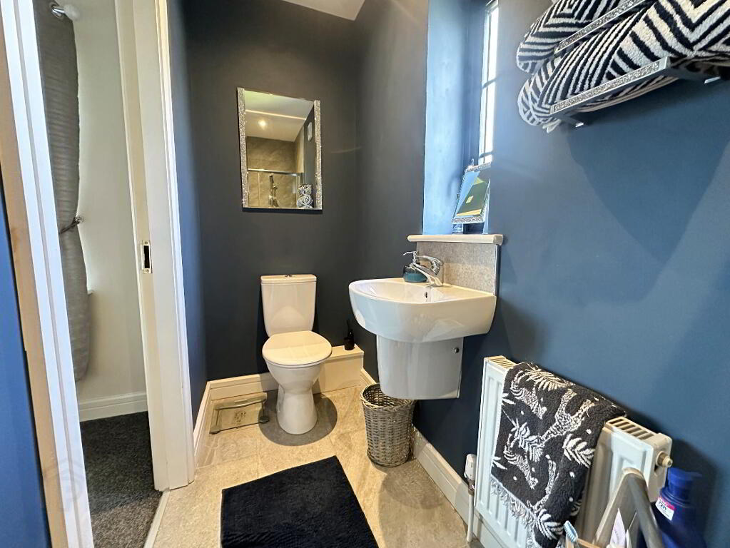 With low flush WC and wall hung wash hand basin and mixer tap, tiled floor, 1 radiator.