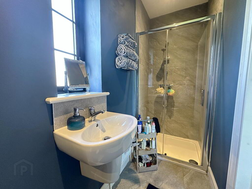 White suite comprising low flush WC, wall hung wash hand basin with mixer tap and fully tiled shower enclosure with thermostatic mixer shower, tiled floor, recessed ceiling spots, 1 radiator.