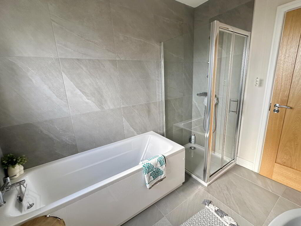 White suite comprising low flush WC, wall hung wash hand basin with mixer tap, panel bath with mixer tap and fully tiled corner shower cubicle with thermostatic mixer shower, part tiled walls, fully tiled floor, recessed ceiling spots, 1 radiator.