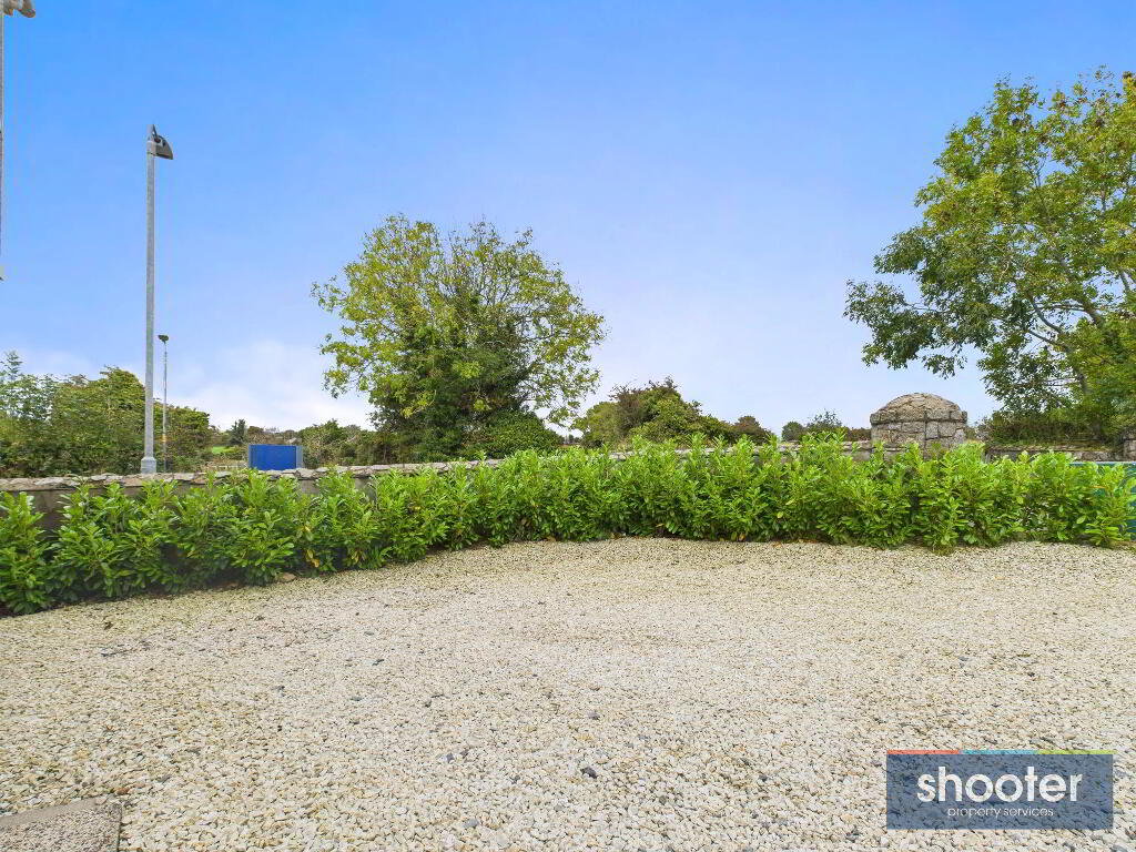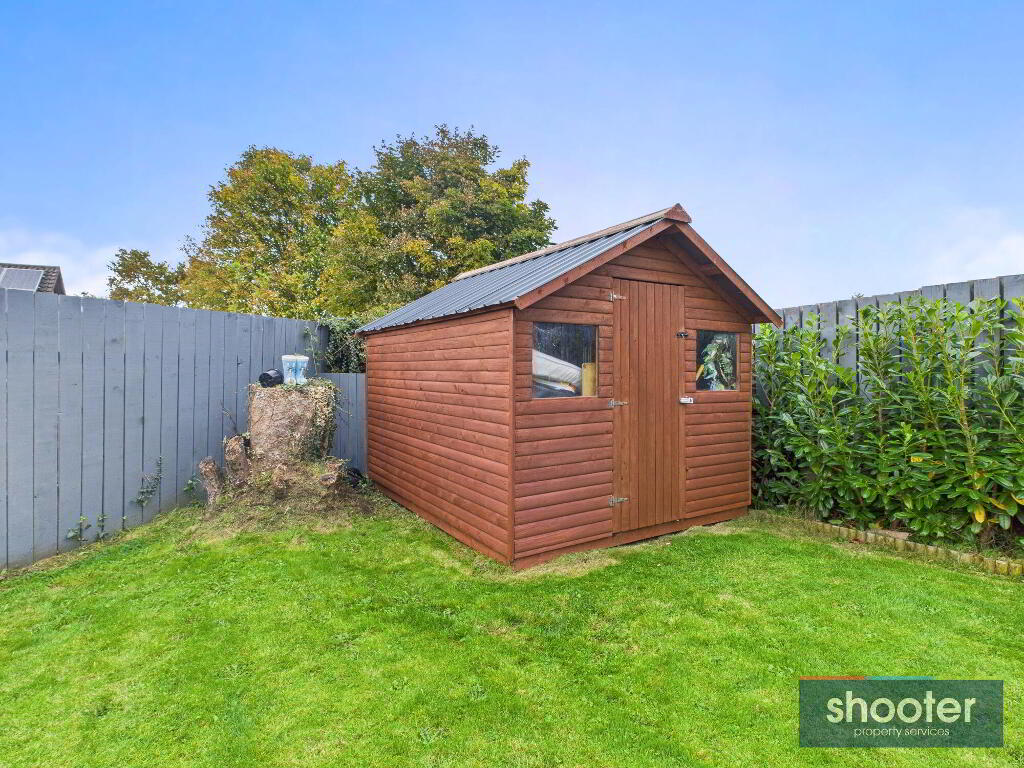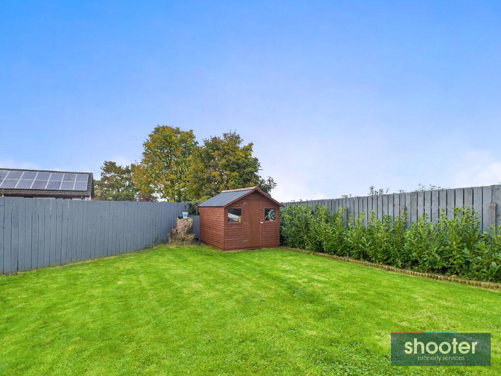 Tarmacadam / decorative stone driveway with parking to front and side. Natural stone / concrete wall and laurel hedge. Canopy shelter, outside light and post box. Enclosed rear garden with gated access to either side of property. Paved patio area. Large grass lawn with wooden fence boundary and laurel hedge. Garden shed. Outside light and water tap.