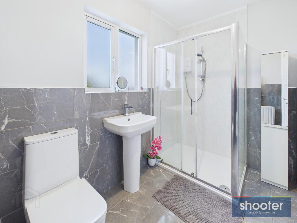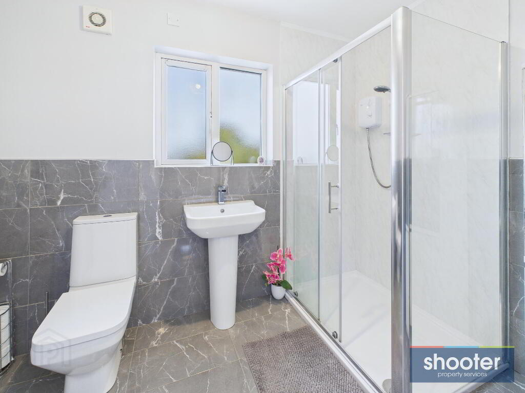 Low flush toilet, pedestal wash hand basin, tall vanity unit and enclosed shower cubicle with sliding door and Triton Enrich electric shower unit. Extractor fan. Ceramic tile floor and part tiled walls.