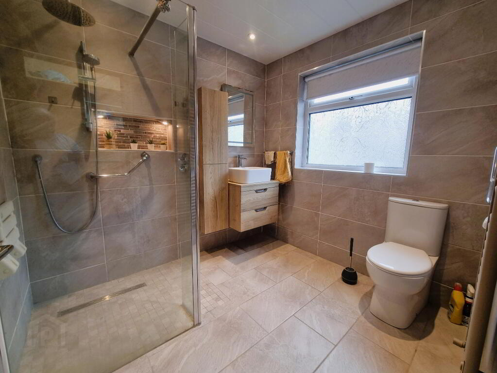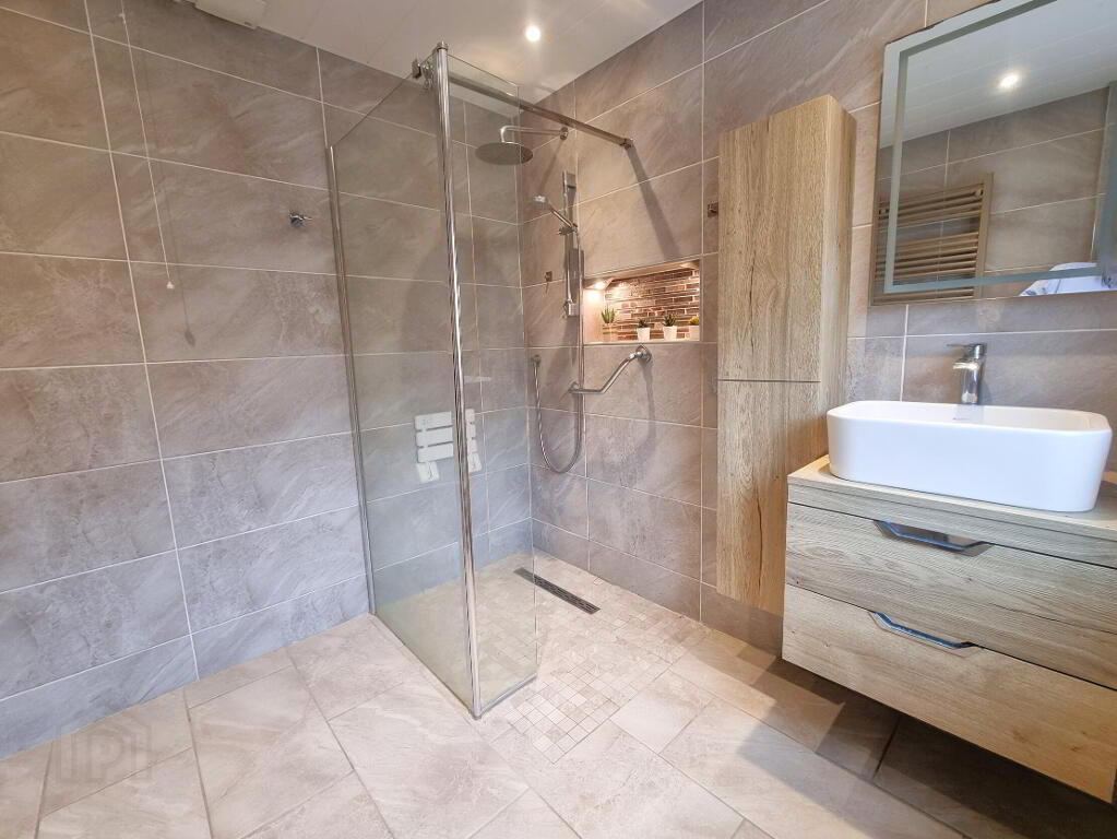 - Modern white suite comprising low flush WC, vanity sink unit and walk-in shower with Mira shower unit and rainhead fixed shower head. Fully tiled walls and ceramic tiled floor, recessed lighting, towel radiator.