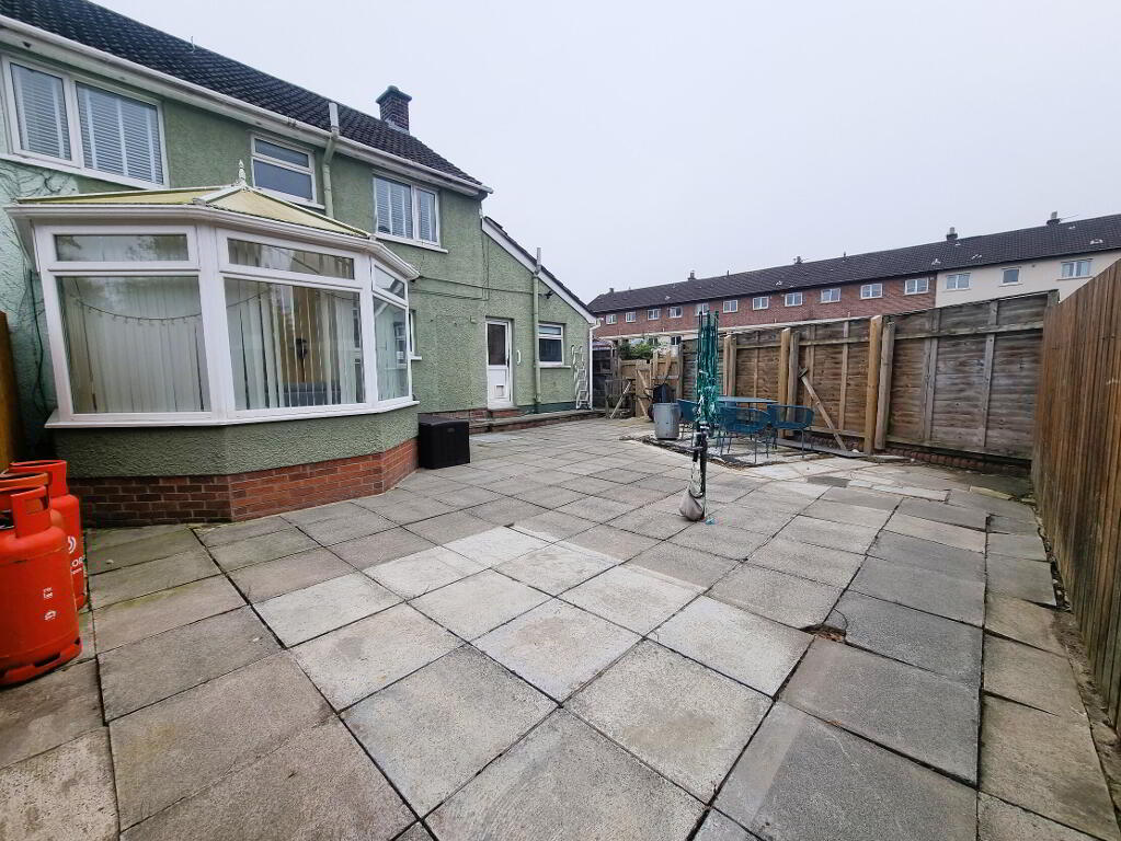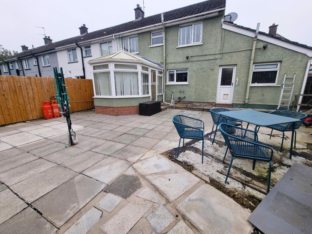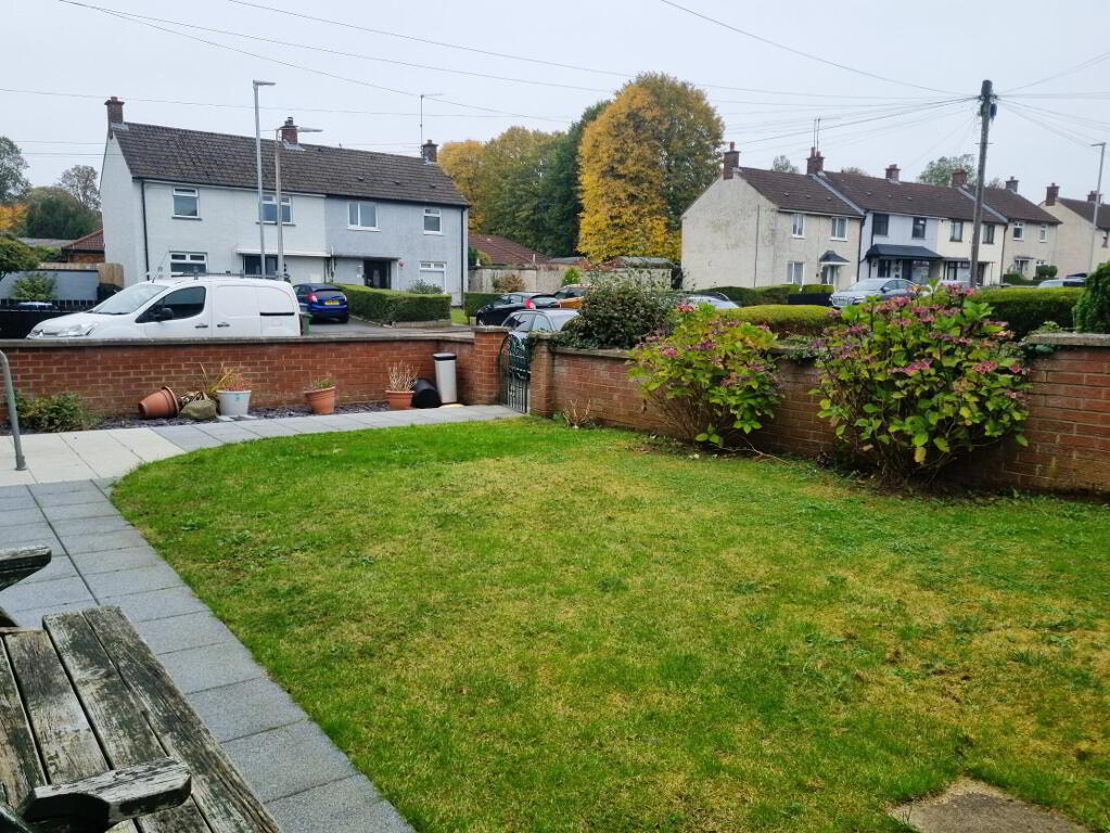 - Front gardens laid in lawns bordered by rendered wall, fully enclosed rear gardens laid in patio, storage area to the side.