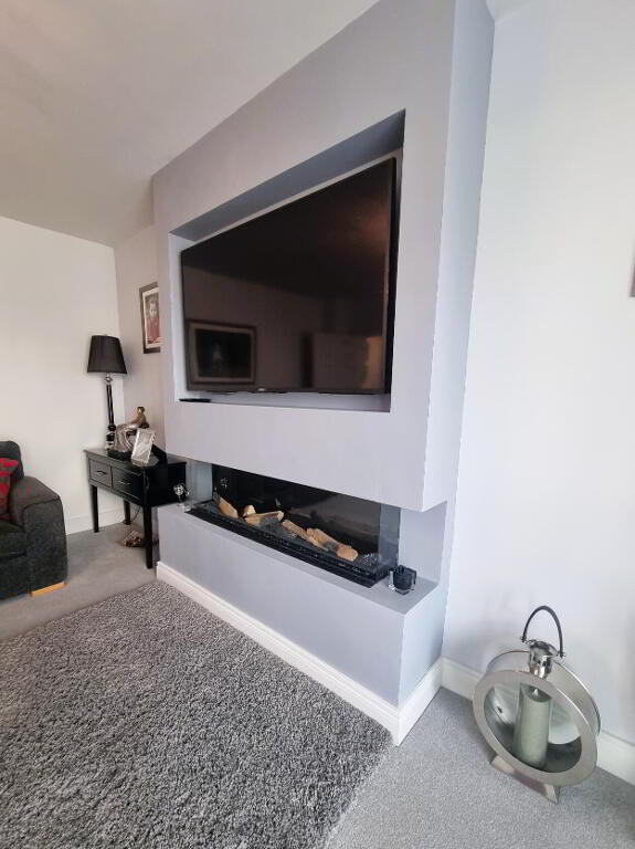 Feature media wall with inset for TV, wrap around electric fire, radiator.