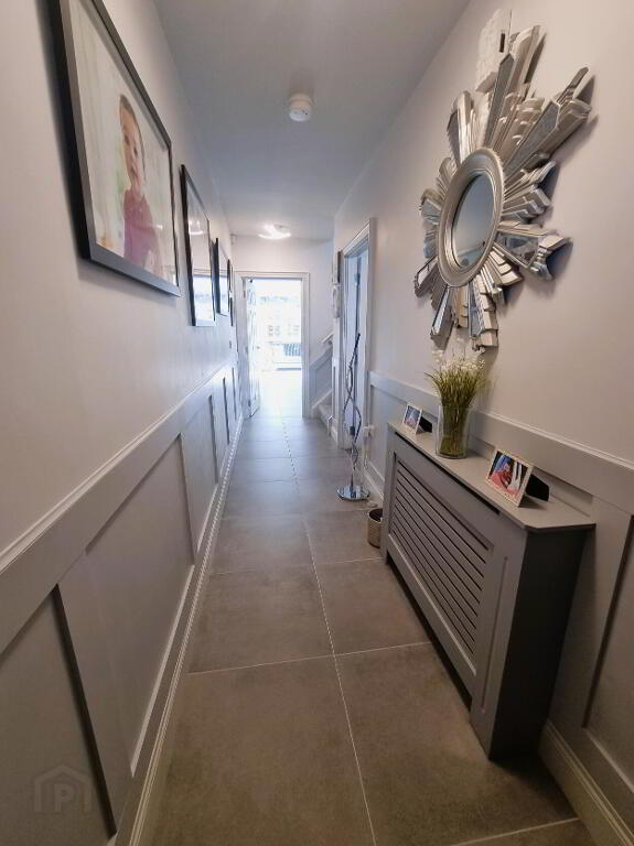 Composite front door, ceramic tiled floor, feature wall panelling, radiator.