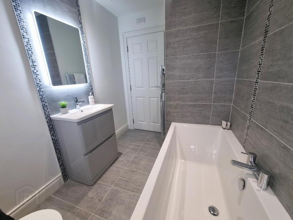 Luxury white suite comprising low flush WC, vanity sink unit and panel bath with centre mixer taps, LED mirror, part tiled walls, ceramic tiled floor, chrome towel rail, recessed lighting.