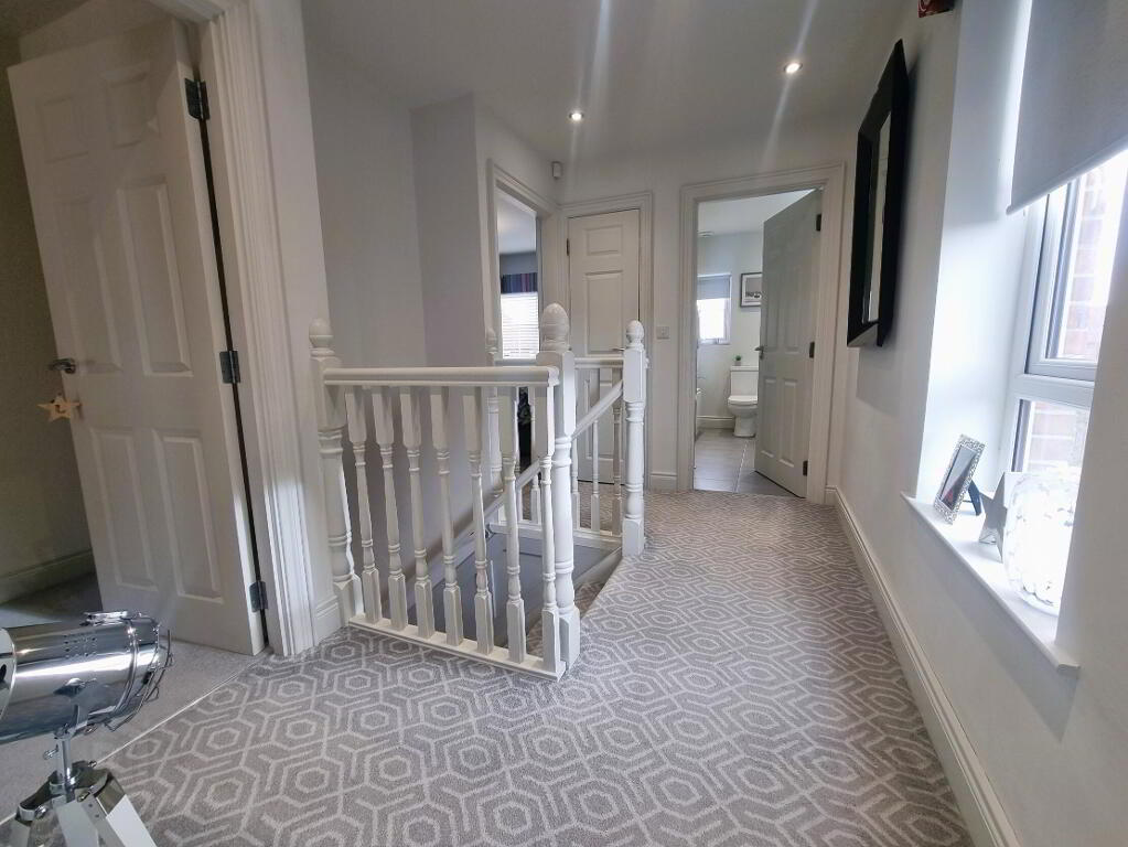 Bright, spacious landing with feature wood panelling, access to roofspace, recessed lighting, built-in storage cupboard.