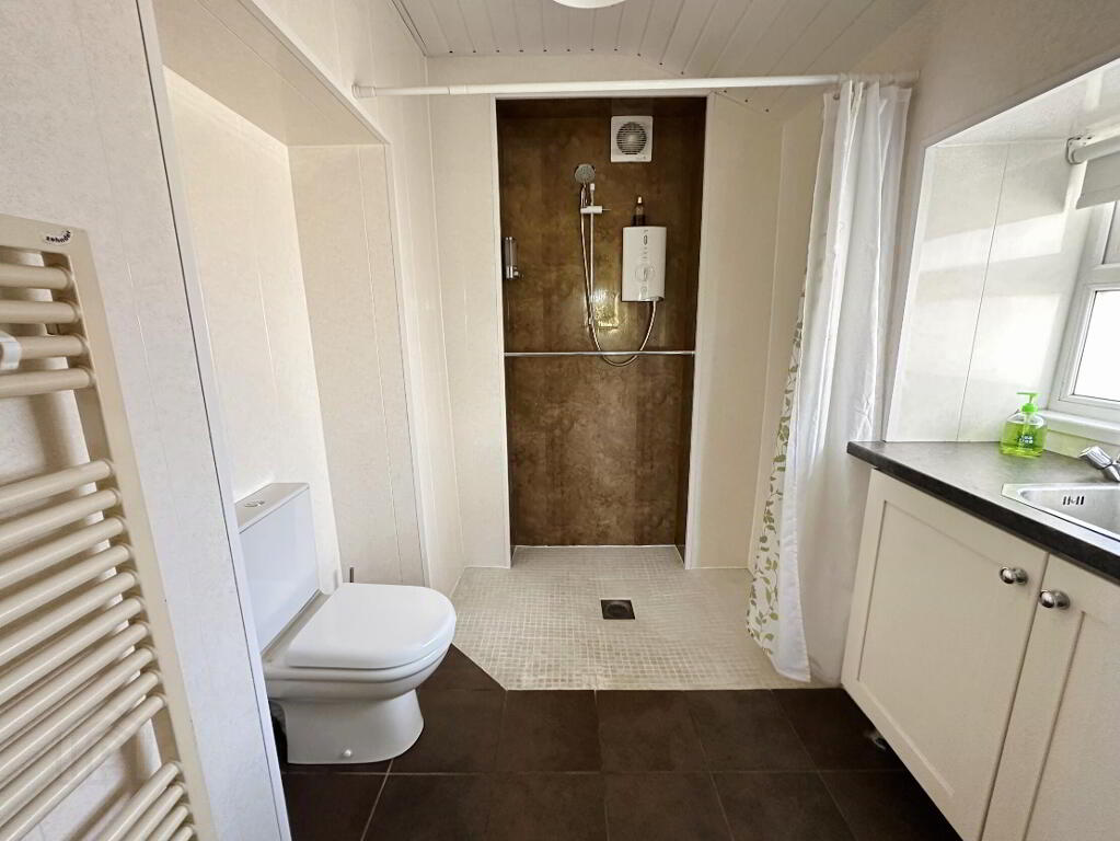 With low flush WC, vanity unit with wash hand basin and shower area with Mira Sport electric shower unit, PVC panelled walls and ceiling, tiled floor, heated towel rail.