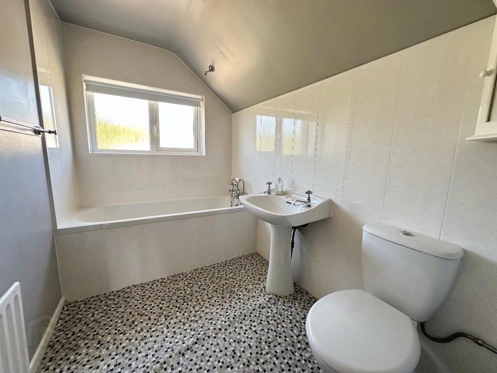 White suite comprising low flush WC, pedestal wash hand basin and panel bath with mixer tap shower attachment, part PVC panelled walls, 1 radiator.
