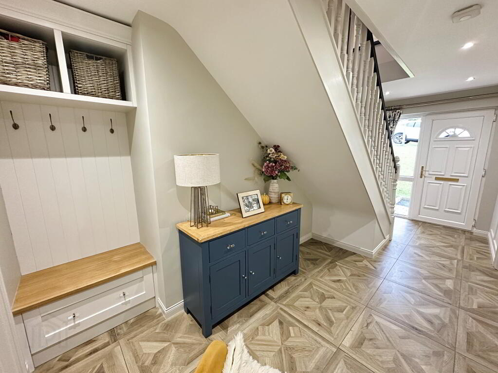- PVC front door with double glazed side screen to spacious hall with fully tiled floor and 3/4 panelled walls incorporating coat rack and storage, telephone point, recessed ceiling spots, ornate radiator.