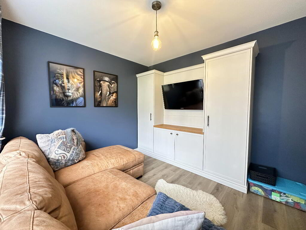 - Fitted modern TV unit with storage cupboards, laminate wooden floor, double radiator.