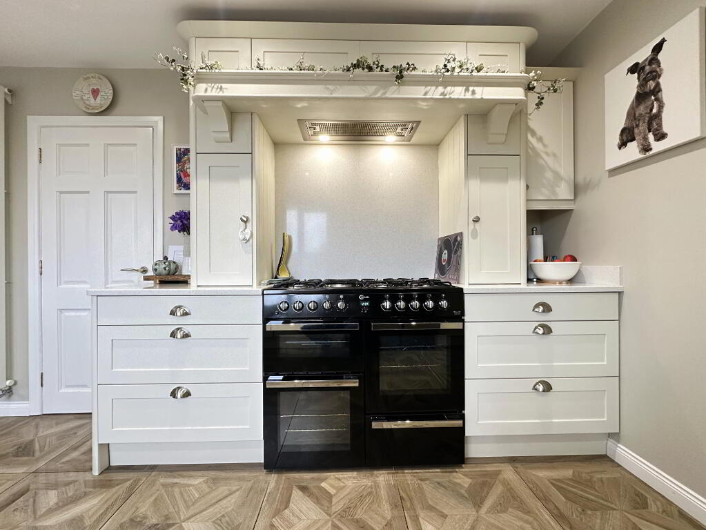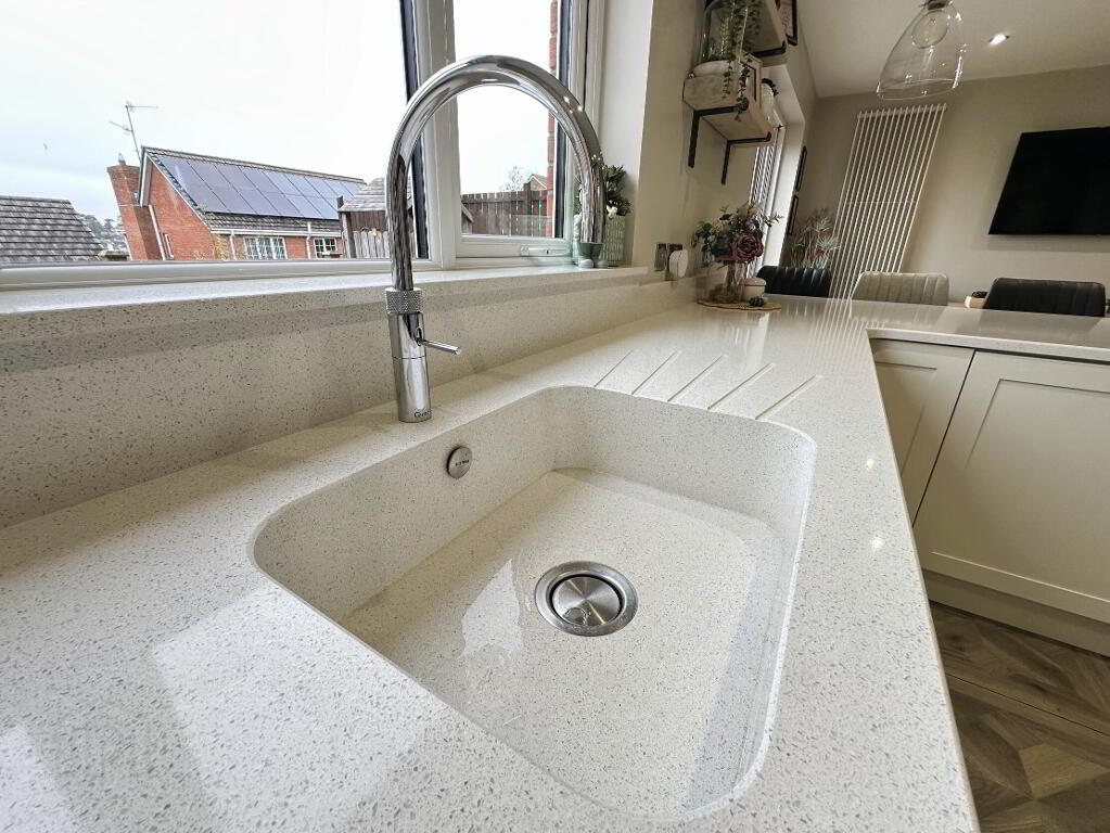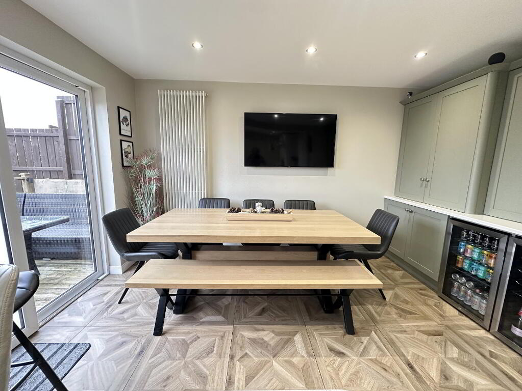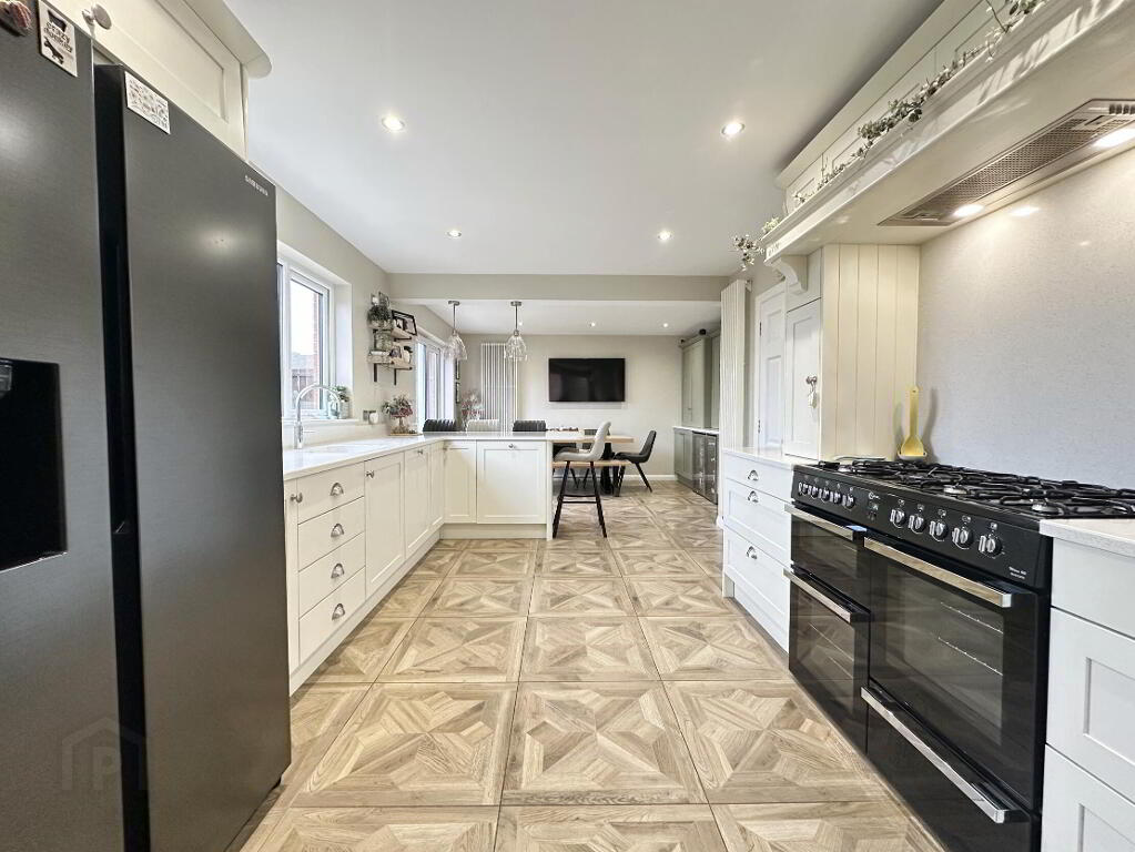 - Full range of stunning high and low level units in two tone finish, quartz worktops and sink with upstands, Quooker hot water top, and breakfast bar. Housing with space for Range Cooker, back splash and extractor fan and light, housing for American style fridge/freezer, fully integrated dishwasher and spaces for under unit drinks chillers below concealed backlit drinks storage cupboard, recessed ceiling spots, PVC double glazed patio door to rear, fully tiled floor, 2 vertical radiators.