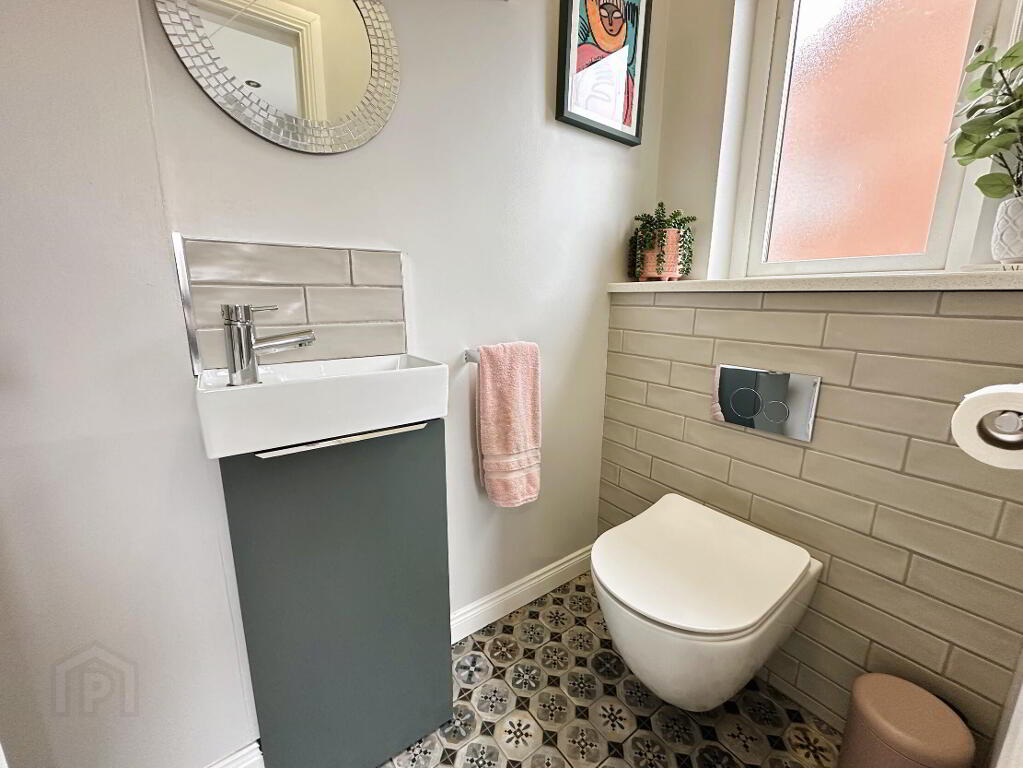 - With concealed WC and vanity unit with wash hand basin, tiled floor, part tiled walls, ornate radiator.