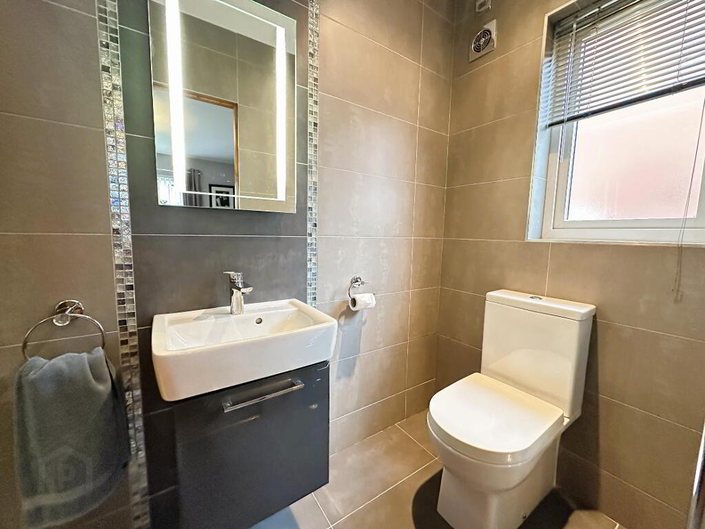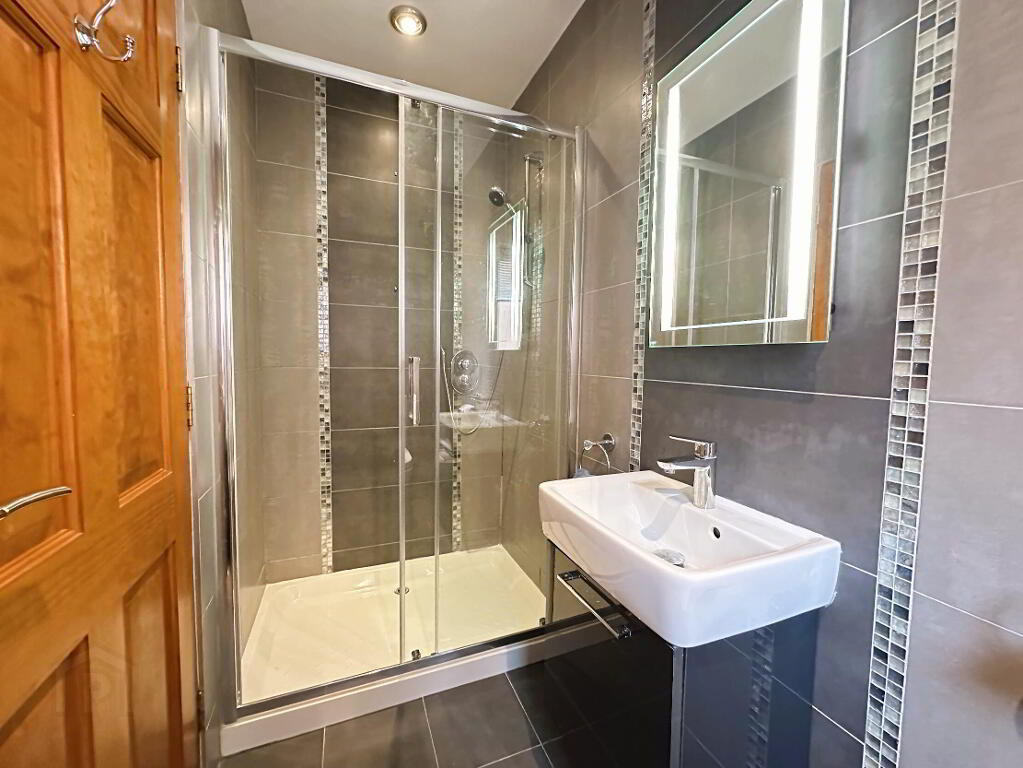 - Modern white suite comprising low flush WC, wall hung wash hand basin with mixer tap and double shower enclosure with thermostatic mixer shower, tiled floor, fully tiled walls with LED mirror, recessed ceiling spots, heated chrome towel rail.