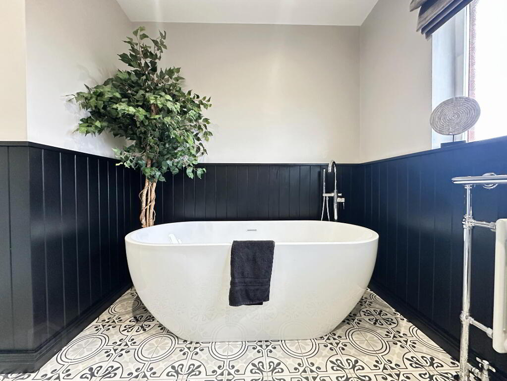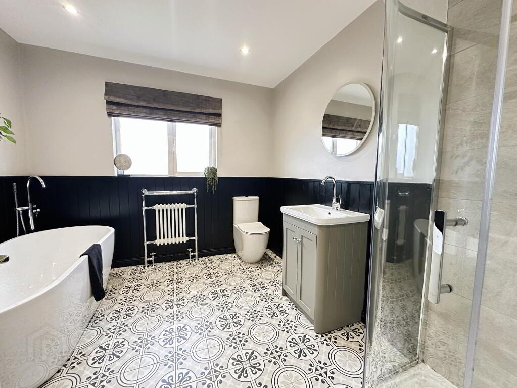 - Luxury white suite with low flush WC, vanity unit with sink unit and mixer tap, freestanding bath and mixer tap with shower head attachment, and fully tiled quadrant shower cubicle with thermostatic mixer shower, handheld and fixed rain head attachments, 1/2 panelled walls, fully tiled floor, recessed ceiling spots, ornate towel radiator.