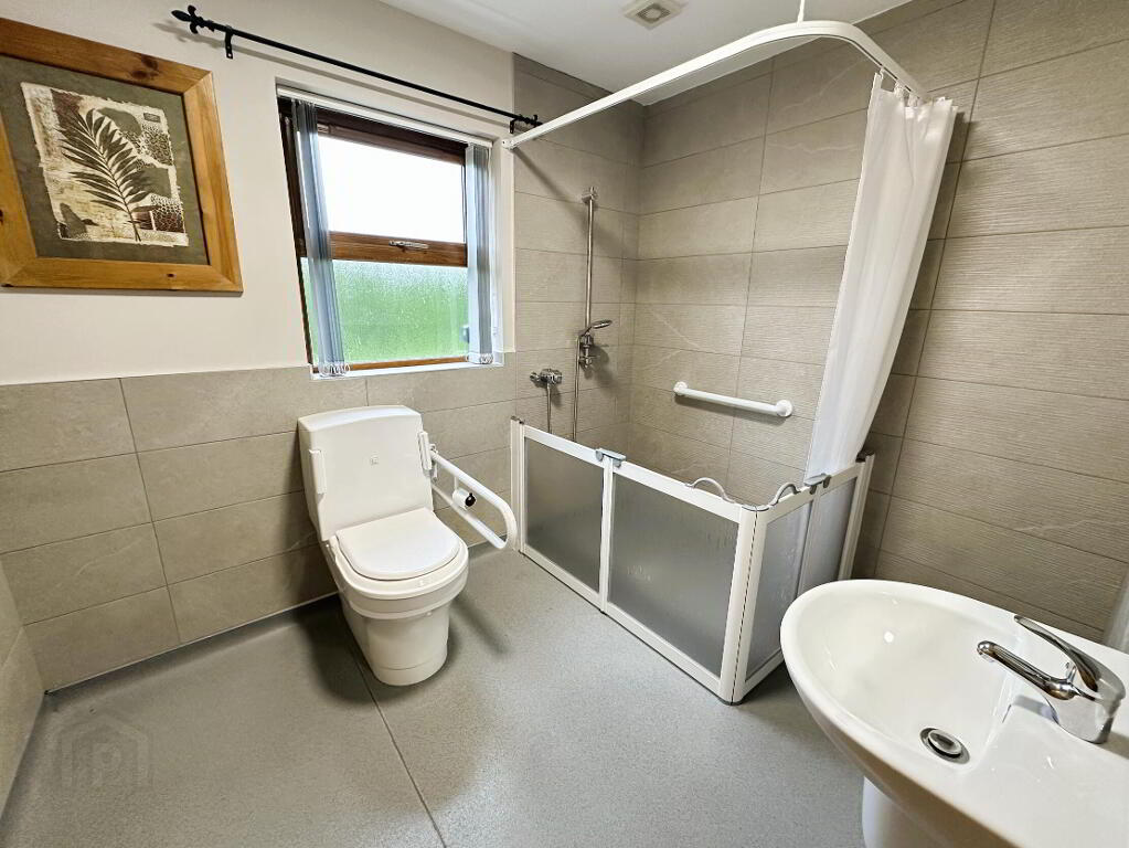 Wet room with low flush WC, wall mounted sink and thermostatic mixer shower, part tiled walls, double radiator.