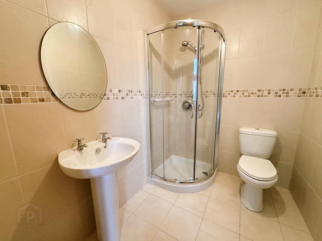 White suite comprising low flush WC, pedestal wash hand basin and quadrant shower cubicle with thermostatic mixer shower, fully tiled walls and floor, recessed ceiling spots, 1 radiator.